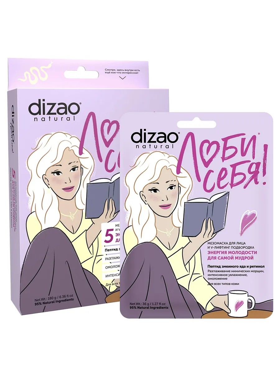 Бренд Dizao ДИЗАО ЛЮБИ СЕБЯ МЕЗОМАСКА ДЛЯ ЛИЦА И V-ЛИФТИНГ ПОДБОРОДКА ЭНЕРГИЯ МОЛОДОСТИ ДЛЯ САМОЙ МУДРОЙ ПЕПТИД ЗМЕИНОГО ЯДА И РЕТИНОЛ Внешний вид: Салфетка пропитанная гелеобразной текстурой прозрачного цвета с легким, освежающим запахом. Форма маски: лицо, подбородок. Специальные особенности: Без парабенов, без пропиленгликоля, без силиконов, без токсинов. Энергия молодости для самой мудрой. Энергия любви к себе в сочетании с уникальными мио-релаксирующими свойствами пептида змеиного яда, регенерирующими свойствами ретинола и полезными свойствами активных ингредиентов в мезомаске позволяет добиться максимального результата. Змеиный пептид - блокирует нервный импульс и снижает способность мышцы к движению, разглаживая мимические морщины и предотвращая появление новых, восстанавливая упругость кожи и ее природную эластичность. Змеиный пептид обладает накопительным эффектом, средства с ним необходимо использовать курсами. Ретинол (Витамин А)- запускает процессы обновления клеток в эпидермисе, обладает мощным восстанавливающим действием, стимулирует выработку коллагена, способствует разглаживанию морщин и удержанию влаги, улучшает тургор кожи, подтягивает овал лица, отбеливает, выравнивает тон и рельеф кожи, защищает от негативного воздействия окружающей среды и солнечного излучения. Видимый эффект: Кожа интенсивно увлажнена, более упругая и эластичная Уменьшены признаки старения кожи Тон кожи более ровный Отличное настроение! Активные компоненты: Гиалуроновая кислота - увлажняет и поддерживает оптимальный уровень содержания влаги, омолаживает, активизирует выработку коллагена и эластина, оказывает лифтинговое действие, разглаживает поверхностные морщины. Витамин C - стимулирует синтез коллагена, оказывает осветляющее действие, укрепляет стенки сосудов и капилляров, является отличным антиоксидантом, защищает кожу от свободных радикалов и сокращает признаки фотостарения. Токоферол (Витамин Е) - «Витамин молодости» - уменьшает глубину морщин, стимулирует синтез коллагена, способствует удержанию влаги в коже, придает гладкость, тонизирует, ускоряет регенерацию тканей, замедляет процесс старения, обладает антиоксидантными свойствами. Экстракт хризантемы - по содержанию витаминов С и Е превосходит все известные науке растения, обладает выраженным омолаживающим действием, увлажняет и тонизирует кожу, способствует регенерации кожи, стимулирует синтез коллагена, улучшает циркуляцию крови, защищает кожу от воздействия ультрафиолета. Экстракт ледяного гриба - стимулирует собственные защитные механизмы кожи и защищает от неблагоприятного воздействия внешних факторов, путем формирования на ее поверхности мягкой увлажняющей пленки, обладает антивозрастными, сосудоукрепляющими и антиоксидантными свойствами. Результат: Омоложение. Разглаживание мимических морщин. Интенсивное увлажнение.