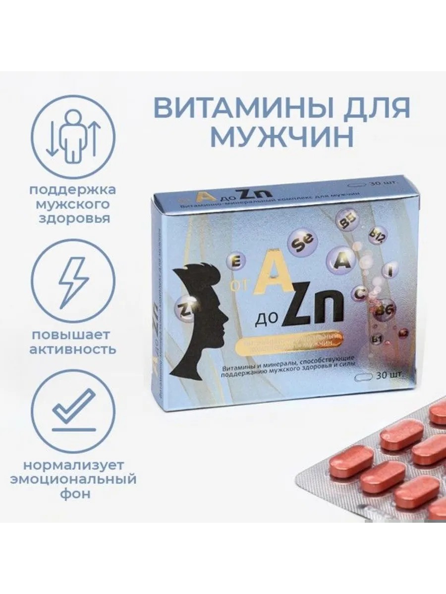 Фармакологические свойства: физическое состояние мужчины во многом зависит от его настроения, переживаний, эмоций. Ведь сохранять спокойствие, принимать решения, нести ответственность за себя и свою семью — это значит, помимо прочего, испытывать постоянное психологическое напряжение. В итоге, со временем, повышенные эмоциональные нагрузки не лучшим образом сказываются на состоянии здоровья. В частности, мужчины чаще болеют сердечно-сосудистыми заболеваниями, чем женщины.Компоненты «Витаминно-минерального комплекса для мужчин от А до Zn» помогут сохранить жизненный тонус, активность и работоспособность, снизить риск сердечно-сосудистых заболеваний.Состав: носитель: микрокристаллическая целлюлоза Е460 (i); L-карнитина тартрат, L-таурин, кислота аскорбиновая, цинка цитрат, токоферола ацетат, никотинамид; носитель: гидроксипропилметилцеллюлоза Е464; антислёживающий агент: тальк Е553 (iii); краситель: диоксид титана Е171; ретинола ацетат; носитель: мальтодекстрин; кальция D-пантотенат; антислёживающие агенты: диоксид кремния аморфный Е551, магния стеарат Е470; носители: кроскарамеллоза натрия Е468, кислота стеариновая Е570; влагоудерживающий агент: пропиленгликоль; меди цитрат, пиридоксина гидрохлорид, тиамина гидрохлорид, рибофлавин; краситель: медного комплекса хлорофиллина натриевая соль Е141 (ii); кислота фолиевая, калия йодат, натрия селенит, цианокобаламин.Показания к применению: рекомендуется в качестве биологически активной добавки к пище для мужчин — дополнительного источника витаминов С, Е, А, группы В (В1, В2, РР, В5, В6, фолиевой кислоты, В12), микроэлементов (цинка, меди, йода, селена), источника L-карнитина, L-таурина.Способ применения: взрослым, по 1 таблетке в день во время еды. Продолжительность приема — 1 месяц.Противопоказания: индивидуальная непереносимость компонентов. Перед применением рекомендуется проконсультироваться с врачом.