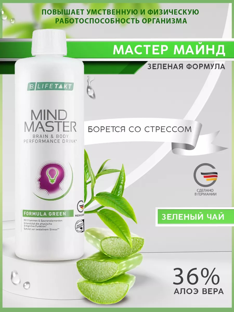 ЛР ЛАЙФТАКТ Питьевой гель Майнд Мастер зеленая формула со вкусом зелёного чая. Содержит сбалансированный комплекс витаминов направленные специально для борьбы со стрессом. Вы будете энергичнее и полны сил. Эффект был подтверждён в специальных лабораториях в клинике Шарите в Берлине. Продукт сертифицирован и регламентирован. Поможет улучшить работоспособность и повысит ваше стремление идти к вашей цели. Помогает обрести спокойствие и умиротворенность. В состав входит 36% геля Алоэ Вера, чистейшая альпийская вода, экстракт зелёного чая, мощнейший антиоксидантным Resveratrol, витамины В12, В1, Е, фолиевая кислота, хлорофилл из растительных экстрактом, железо, коэнзим Q10, антиоксидант, холин, селен. Гель Алоэ оказывает на организм мощную целебную силу, железо оказывает положительное действие на развитие когнитивных функций, витамин В1 необходим для правильного метаболизма, В12 помогает в работе нервной системы, витамин Е защищает от стресса. Современный мир не стоит на месте, человек ежедневно подвергается стрессу или ещё каким либо нервным расстройствами, Mind Master просто необходим каждому из нас для хорошего самочувствия и продуктивности дня. Употреблять перед едой 80 мл. в день, при необходимости разбавляя водой или соком, после вскрытия хранить в холодильнике. Для большей эффективности необходимо принимать совместно с питьевыми гелями Алоэ Вера или другими пищевыми добавками. Отличный презент для родных и близких, а также коллег, друзей, знакомых. Производство Германия. Объем 500 мл.
