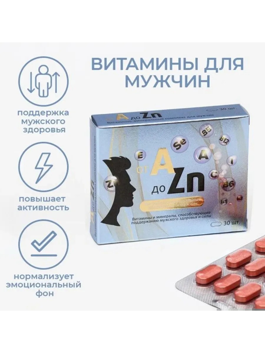 Фармакологические свойства: физическое состояние мужчины во многом зависит от его настроения, переживаний, эмоций. Ведь сохранять спокойствие, принимать решения, нести ответственность за себя и свою семью — это значит, помимо прочего, испытывать постоянное психологическое напряжение. В итоге, со временем, повышенные эмоциональные нагрузки не лучшим образом сказываются на состоянии здоровья. В частности, мужчины чаще болеют сердечно-сосудистыми заболеваниями, чем женщины.Компоненты «Витаминно-минерального комплекса для мужчин от А до Zn» помогут сохранить жизненный тонус, активность и работоспособность, снизить риск сердечно-сосудистых заболеваний.Состав: носитель: микрокристаллическая целлюлоза Е460 (i); L-карнитина тартрат, L-таурин, кислота аскорбиновая, цинка цитрат, токоферола ацетат, никотинамид; носитель: гидроксипропилметилцеллюлоза Е464; антислёживающий агент: тальк Е553 (iii); краситель: диоксид титана Е171; ретинола ацетат; носитель: мальтодекстрин; кальция D-пантотенат; антислёживающие агенты: диоксид кремния аморфный Е551, магния стеарат Е470; носители: кроскарамеллоза натрия Е468, кислота стеариновая Е570; влагоудерживающий агент: пропиленгликоль; меди цитрат, пиридоксина гидрохлорид, тиамина гидрохлорид, рибофлавин; краситель: медного комплекса хлорофиллина натриевая соль Е141 (ii); кислота фолиевая, калия йодат, натрия селенит, цианокобаламин.Показания к применению: рекомендуется в качестве биологически активной добавки к пище для мужчин — дополнительного источника витаминов С, Е, А, группы В (В1, В2, РР, В5, В6, фолиевой кислоты, В12), микроэлементов (цинка, меди, йода, селена), источника L-карнитина, L-таурина.Способ применения: взрослым, по 1 таблетке в день во время еды. Продолжительность приема — 1 месяц.Противопоказания: индивидуальная непереносимость компонентов. Перед применением рекомендуется проконсультироваться с врачом.