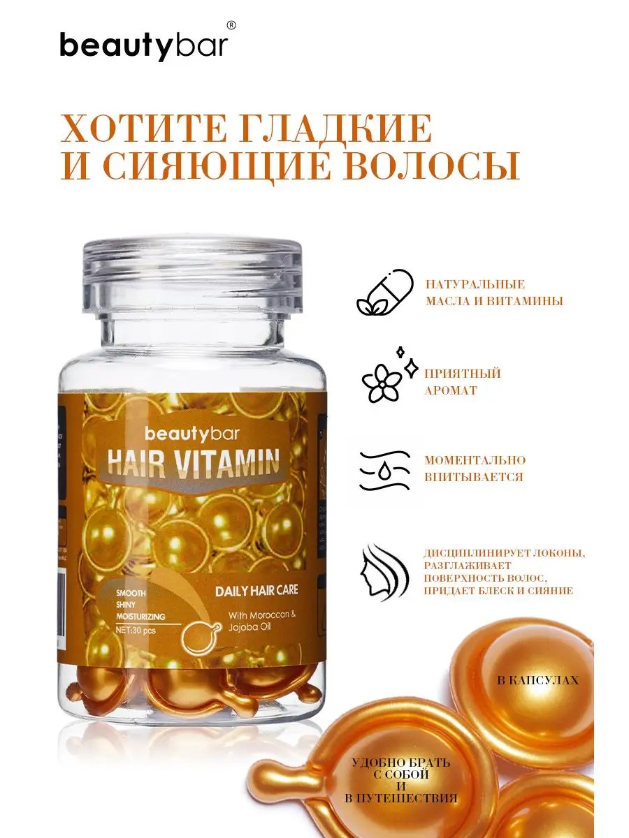 Витамины для гладкости, сияния и увлажнения волос с марокканским маслом, маслом жожоба, маслом алоэ вера, витаминами A, C, E и B5.