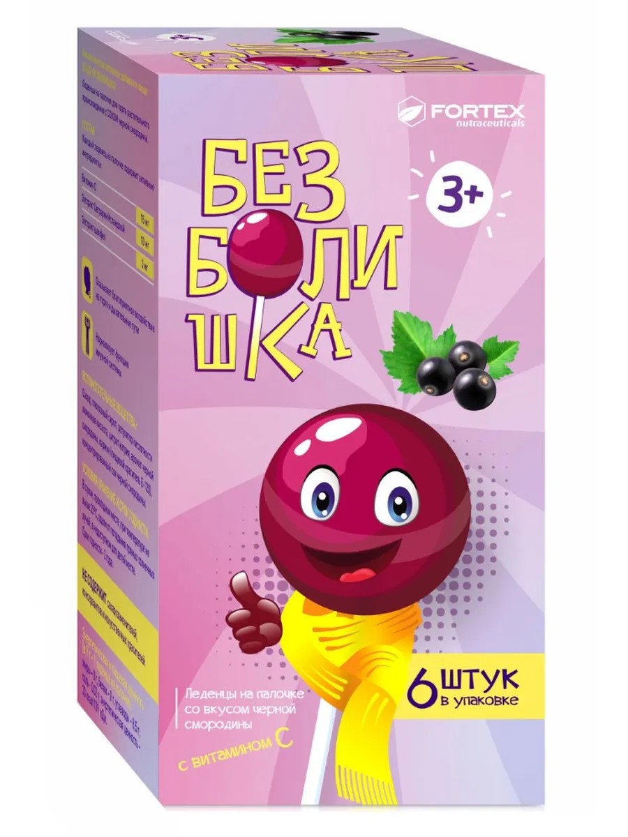 | Полное наименование товара | Безболишка леденец на палочке для горла растительного происхождения с соком черной смородина 6 шт. леденец массой 9 гр |