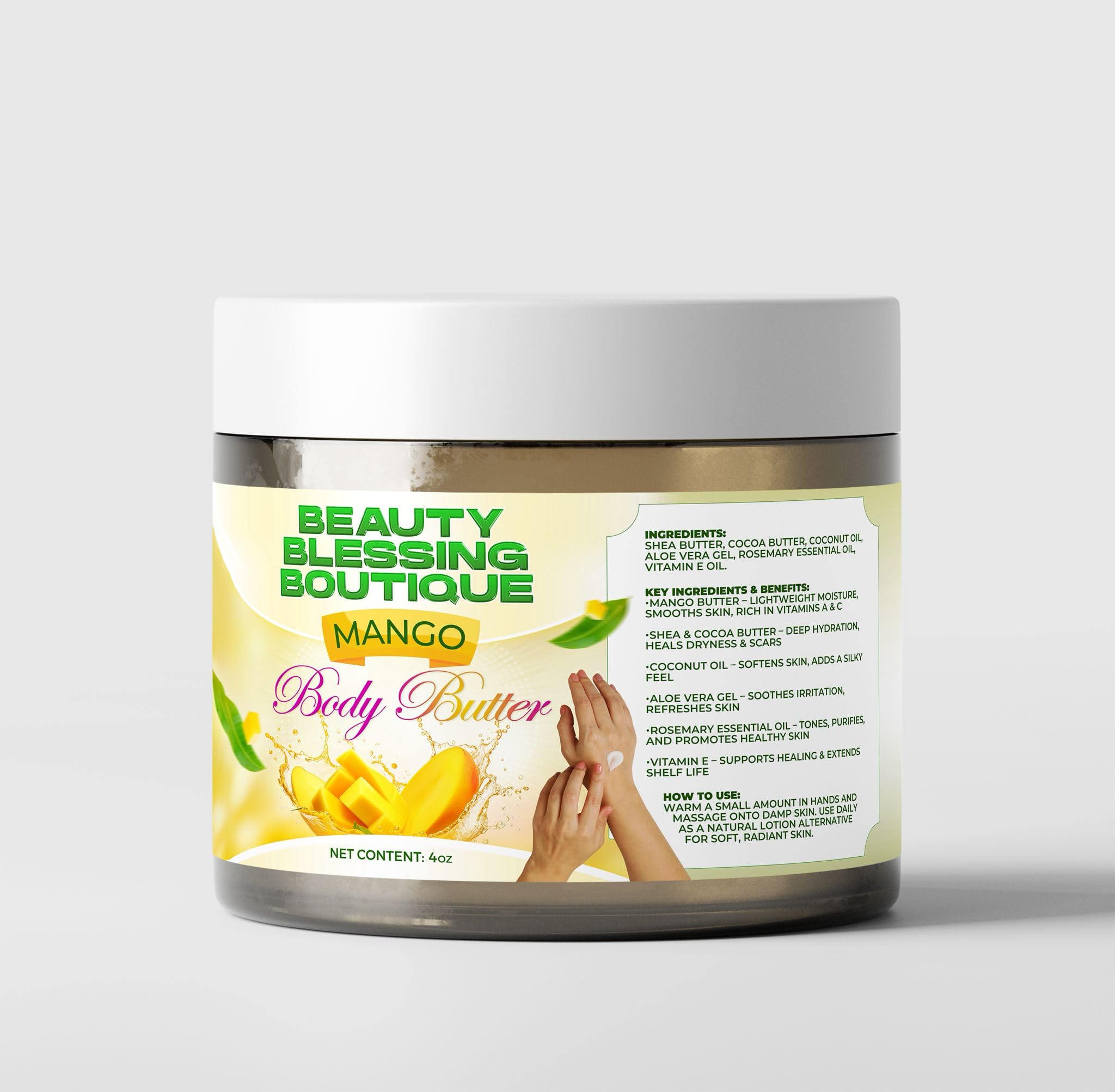 Beauty Blessing Mango Body Butter deeply moisturizes dry skin and leaves it soft, smooth, and glowing. Made with mango butter, shea butter, cocoa butter, coconut oil, aloe vera, rosemary, and vitamin E, this rich blend hydrates, nourishes, and helps soften rough areas like elbows, knees, hands, and feet. Perfect for daily use and all skin types.