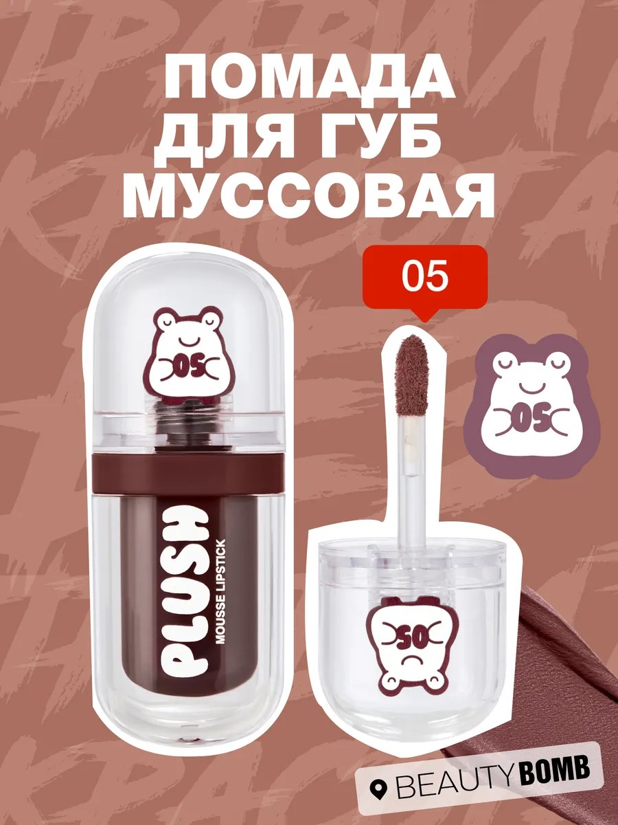 Муссовая помада Plush от Beauty Bomb ( Бьюти Бомб ), словно неощутимое облачко на губах, переместит тебя в настоящую дораму. У нее вельветовая текстура, которая оставляет мягкий матовый финиш и не сушит губы. Выбирай оттенок стойкой жидкой матовой помады под любой случай, будь то ночевка у подруги или концерт любимого айдола! С помощью маленького пушистого аппликатора можно создать четкий контур или эффект зацелованных губ. А также использовать для щёк в качестве жидких кремовых румян. Милая двухслойная упаковка в корейском стиле украсит твою косметичку. На крышке помады для губ матовой есть тоноуказатель, а номер цвета держит в своих лапках милый зверек.