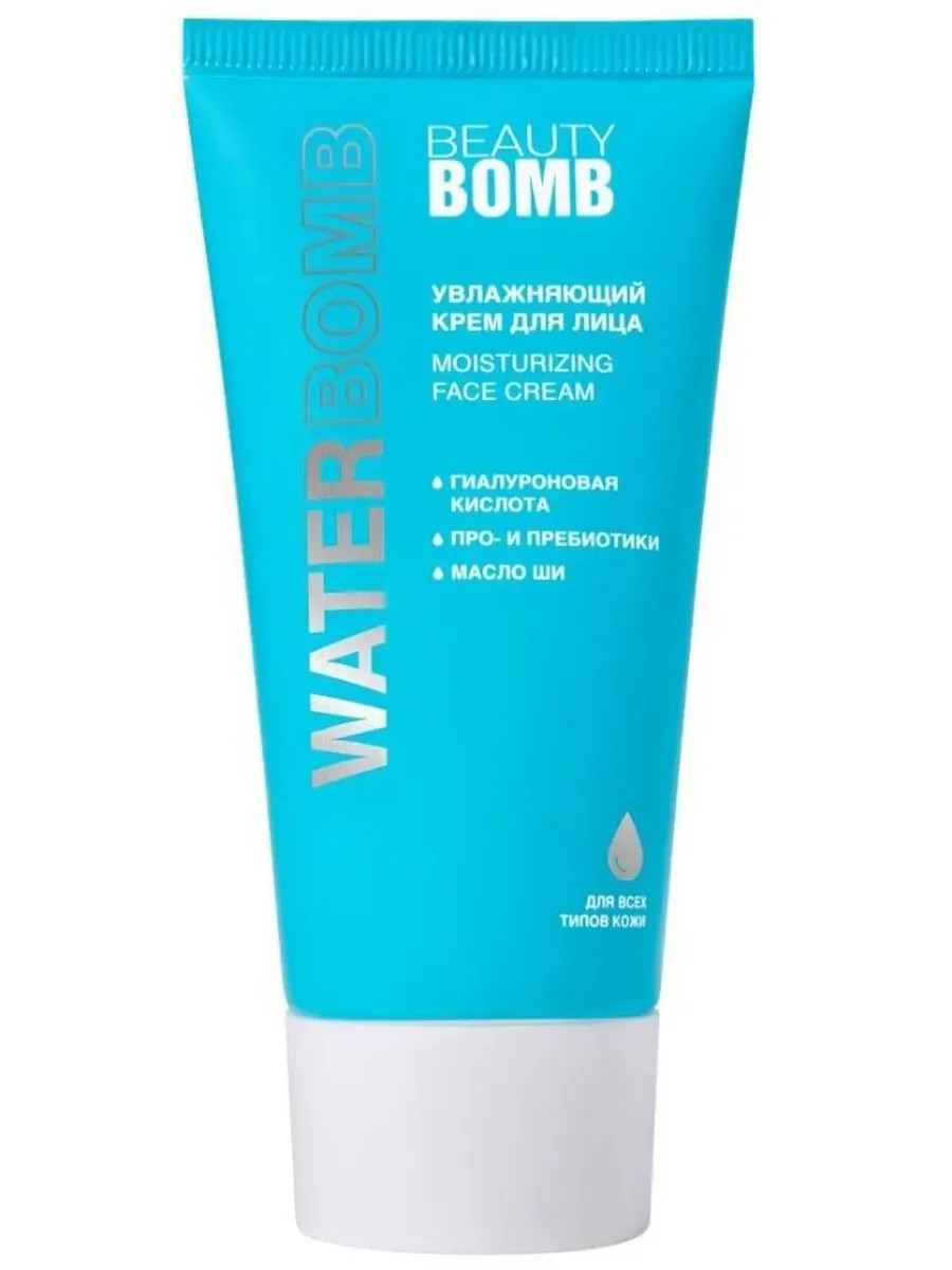 Beauty Bomb Увлажняющий крем для лица Waterbomb, 40 мл. Миссия — обеспечить твою кожу увлажнением и защитой 24/7. Увлажняющий крем для лица с нежной текстурой тает на коже и быстро впитывается. Компоненты данной уходовой косметики заботятся о защитном барьере и микробиоме кожи. Можешь использовать крем в дневное время как базу под макияж и для вечернего ухода. Гиалуроновая кислота увлажняет, придает коже эластичность и упругость, питает, смягчает. Про- и пребиотики укрепляют липидный барьер кожи, нормализуют микрофлору. Масло ши питает кожу, смягчает, заживляет и защищает от внешних воздействий среды. Способ применения: Нанеси небольшое количество крема на очищенную кожу лица и распредели похлопывающими движениями.