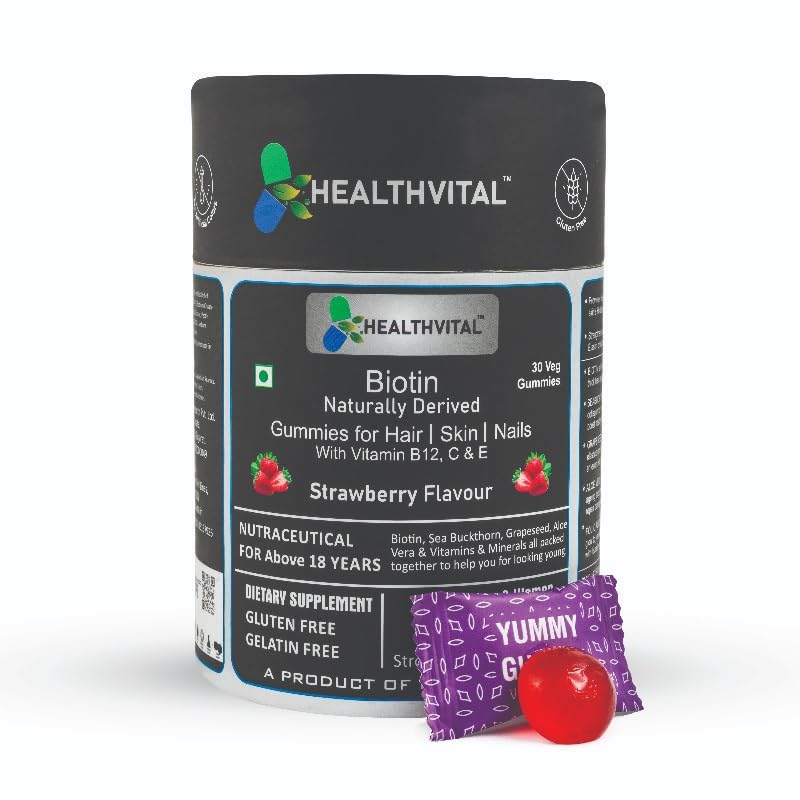 Healthvital Biotin Naturally Derived Gummies are a delicious and convenient way to support healthy hair, skin, and nails. These gummies are formulated with biotin, a water-soluble B-vitamin that plays a crucial role in the body's metabolic processes. Biotin helps promote the growth of strong, lustrous hair, and maintains the integrity of your skin and nails. These gummies are naturally derived, making them a great choice for those seeking a more natural approach to their daily vitamin intake. Simply take two gummies per day, and let the delightful taste and potent biotin work its magic. With a pleasant flavor and easy-to-consume format, these gummies make it effortless to incorporate biotin into your daily routine. Support your overall beauty and wellness with Healthvital Biotin Naturally Derived Gummies.