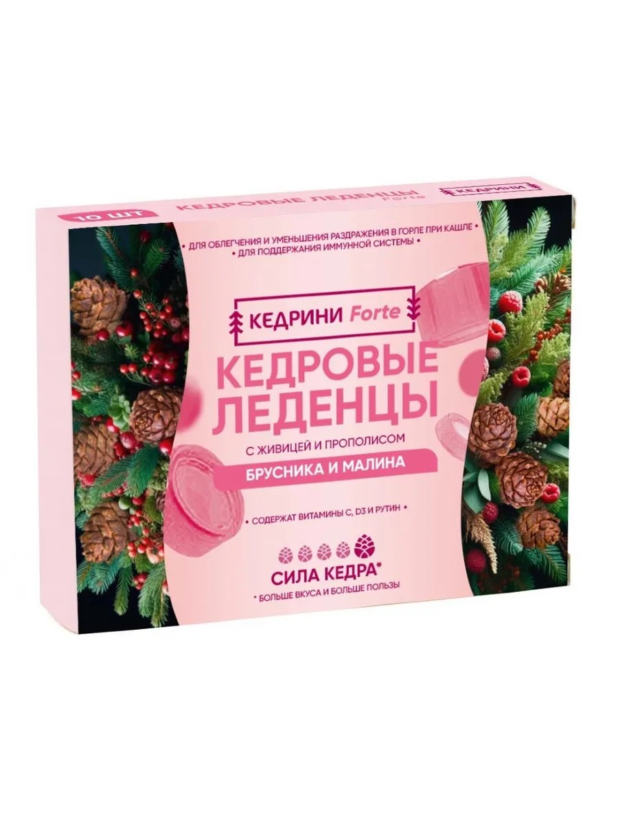 | Полное наименование товара | Кедрини forte кедровые леденцы с живицей и прополисом со вкусом брусника и малина 10 шт. леденцы массой 3,2 г |