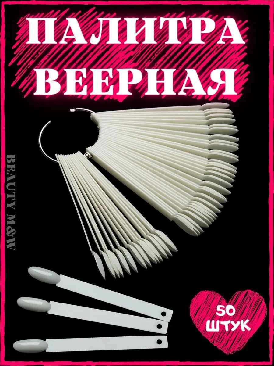 A client can't always decide on a gel polish color, so the palette will show you the entire selection of nail polishes the nail technician has available. This nail palette helps you determine how the color will look on your nails. If a design consists of several colors, demonstration tips will help you compare them and see how well they work together. A manicure palette, consisting of 50 tips for coloring, is considered the best choice when creating your own nail portfolio or demonstration palette. The metal ring closes tightly but opens easily enough to add or remove desired fan-shaped tips. The accessory folds for convenient storage or transport, and can also be hung on a stand. Made of ivory-colored plastic, the surface is smooth, and the tips for manicure and pedicure are almond-shaped. The edges of the manicure tips themselves are carefully finished. A set of plastic tips is a must-have for both beginners and experienced nail technicians. When cured in a manicure lamp, the plastic on the gel polish tips remains intact, resisting deformation, cracking, and yellowing. You can also write on them with a marker or felt-tip pen and apply stickers to the fan-shaped tips.