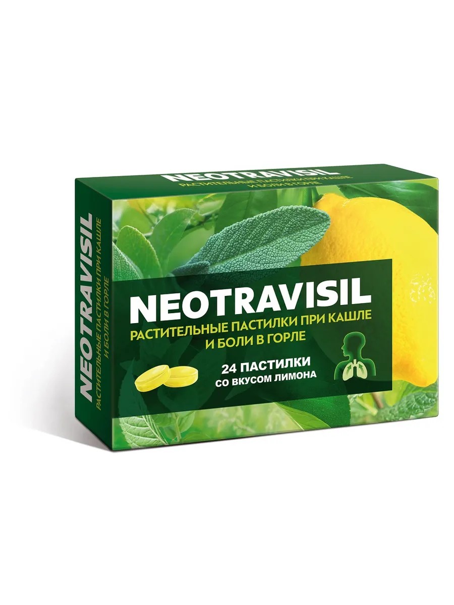 Neotravisil herbal lozenges with lemon flavor Biological action of the components The herbal remedy NEOTRAVISIL contains an innovative combination of 4 herbal extracts: licorice, eucalyptus, camphor cinnamon, mint, as well as orange pod extract, which, due to the complex effect of the components, provide a double effect: they help with cough (dry and wet) and sore throat.