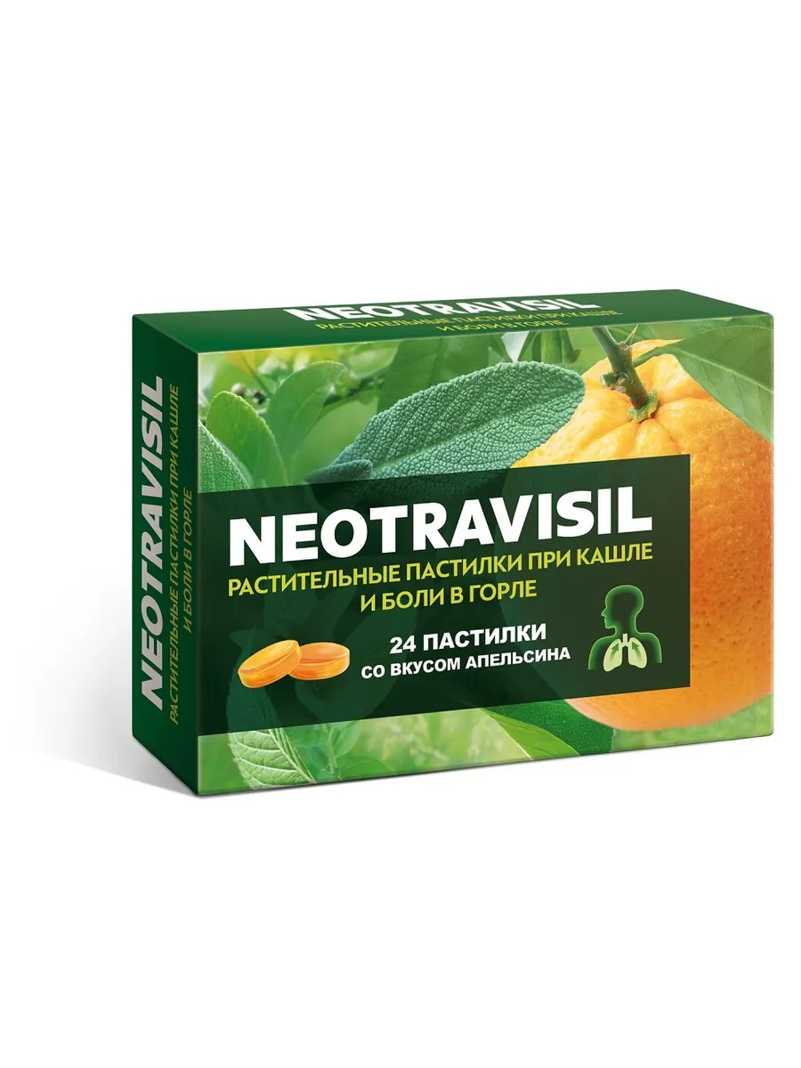 Biological action of the components The herbal remedy NEOTRAVISIL contains an innovative combination of 4 herbal extracts: licorice, eucalyptus, camphor cinnamon, mint, as well as orange pod extract, which, due to the complex effect of the components, provide a double effect: they help with cough (dry and wet) and sore throat.