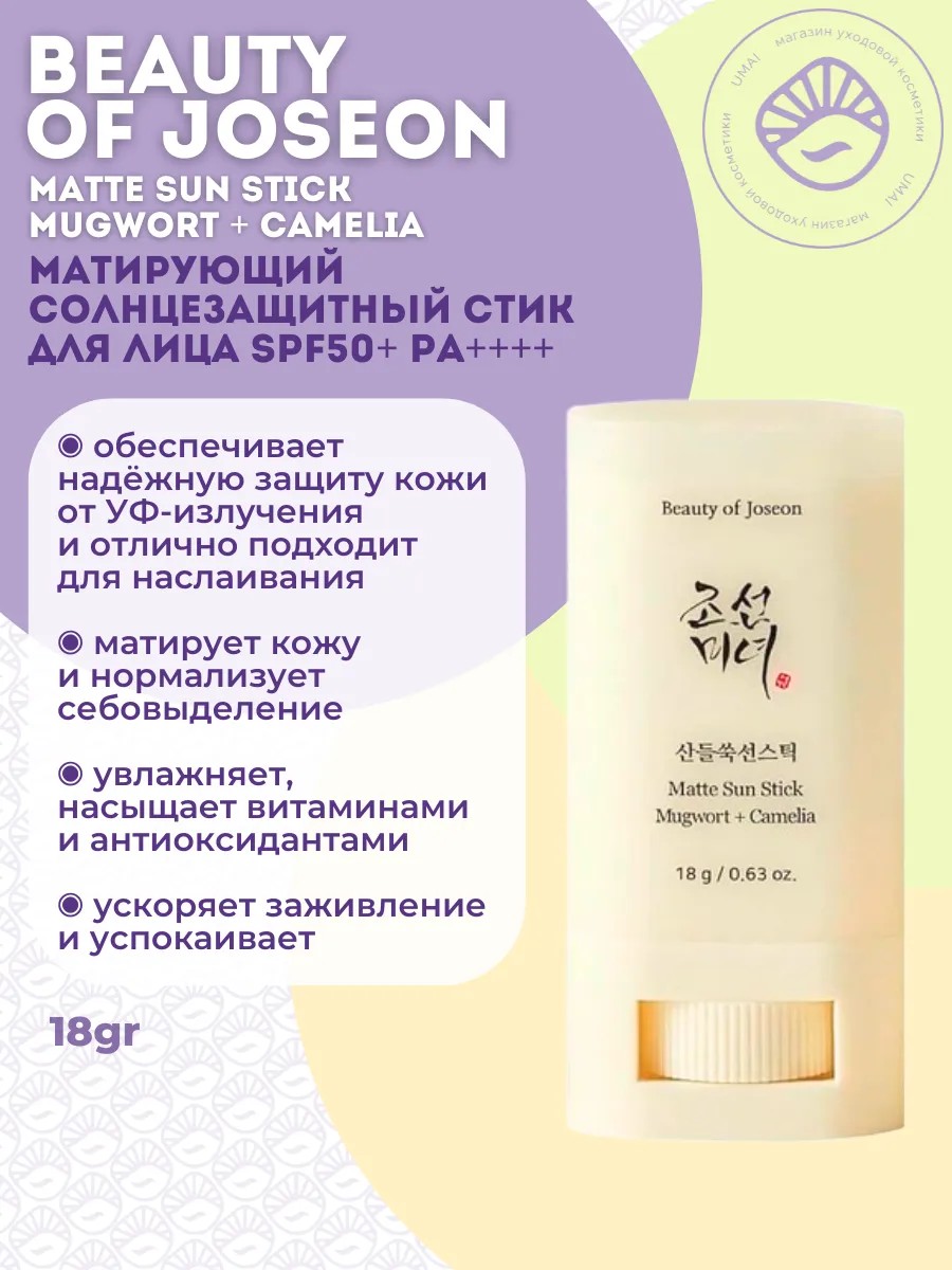 Солнцезащитный стик Beauty of Joseon Matte Sun Stick Mugwort+Camelia SPF50+ PA++++ — матирующее солнцезащитное средство, которое отлично подходит для обновления и наслаивания, позволяет гигиенично и комфортно наносить защитный слой.
