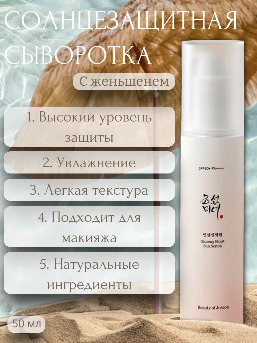 Солнцезащитная сыворотка Beauty of Joseon Ginseng Moist Sun Serum SPF50+ PA++++ с лёгкой текстурой — средство 2-в-1 для ухода за кожей и защиты от солнца. Защищает от вредного воздействия ультрафиолета, омолаживает и поддерживает эластичность.