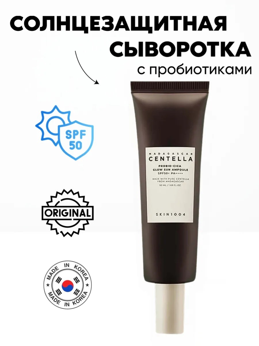 Солнцезащитный крем SKIN1004 Madagascar Centella Probio-Cica Glow Sun Ampoule SPF50+ PA++++ — увлажняющее средство для защиты от солнца, которое не оставляет белых следов.