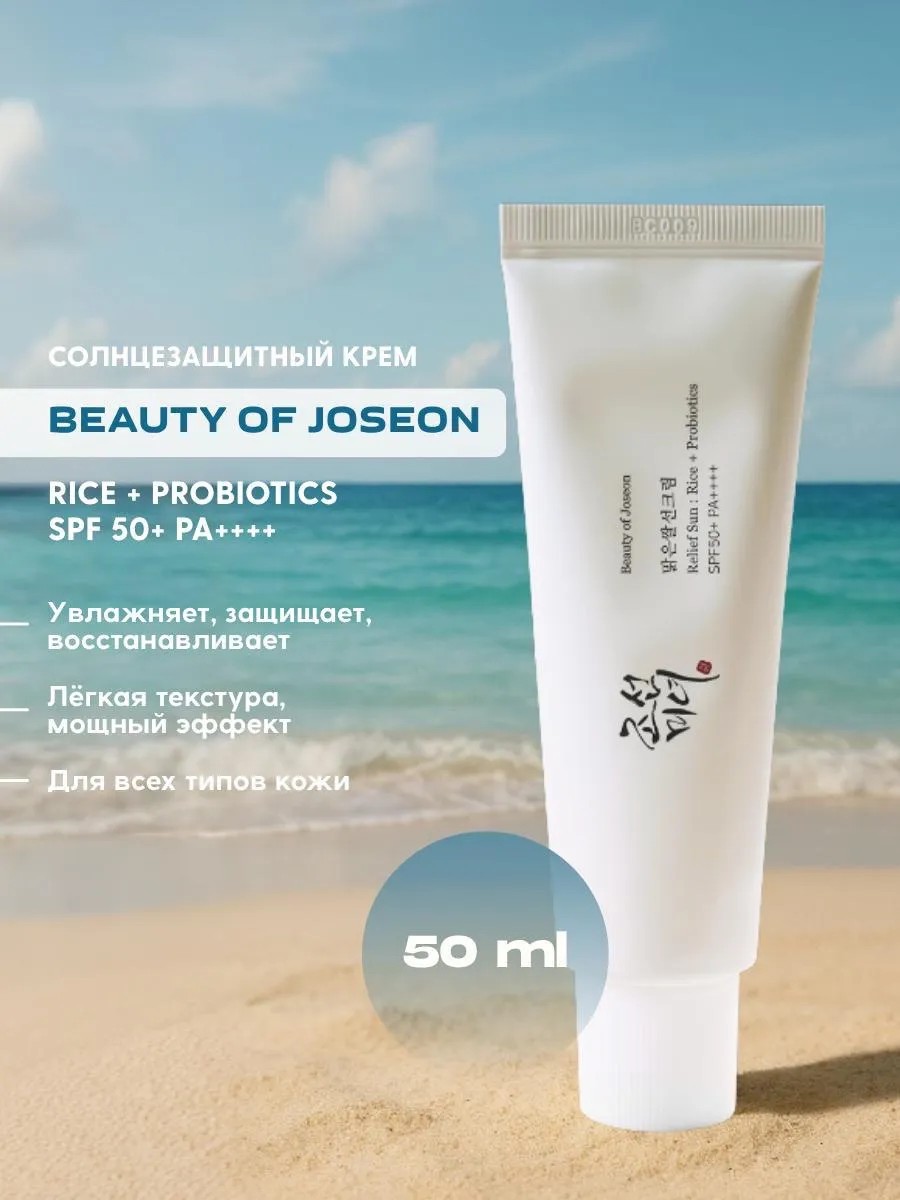 Солнцезащитный крем Beauty of Joseon Relief Sun SPF 50+ PA++++ — это бестселлер корейской косметики нового поколения, созданный для деликатного, но эффективного ухода за кожей лица и защиты от солнечных лучей. Он сочетает в себе максимальную защиту от UVA и UVB-излучения, уходовые компоненты и ультралёгкую текстуру, благодаря которой крем буквально тает на коже. Его основа — экстракт риса (30% и пробиотики, которые интенсивно питают, увлажняют и восстанавливают кожный барьер. Крем подходит для всех типов кожи, включая чувствительную, склонную к покраснениям, акне и раздражениям. У него высокий уровень фотостабильной защиты — PA++++ — что делает средство идеальным даже при активном солнце. Его можно наносить ежедневно, в любое время года, включая весну, лето и отпуск на море.
