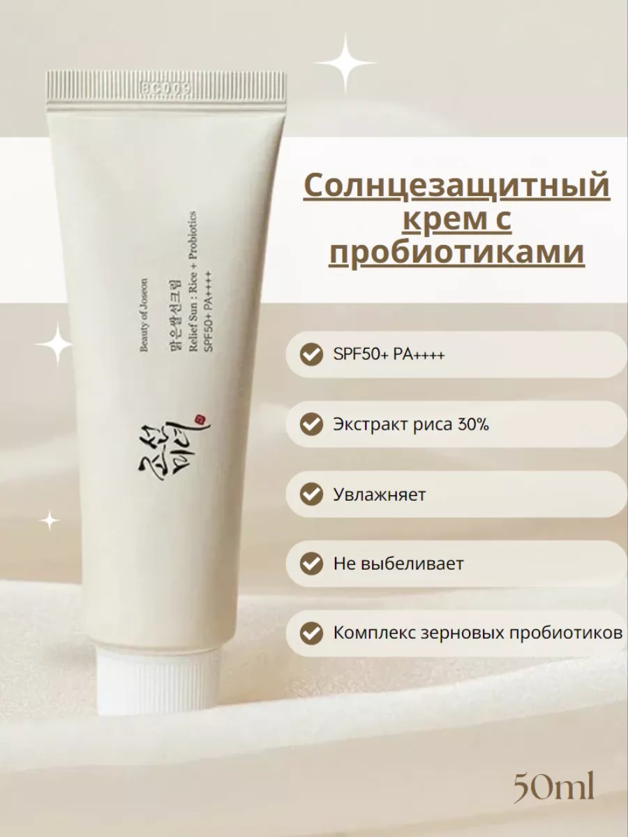 Beauty of Joseon Sun: Rice + Probiotics SPF 50+ PA++++ sunscreen reliably protects the skin from the damaging effects of UVA and UVB rays, blocks melanin synthesis and minimizes the risk of pigmentation.