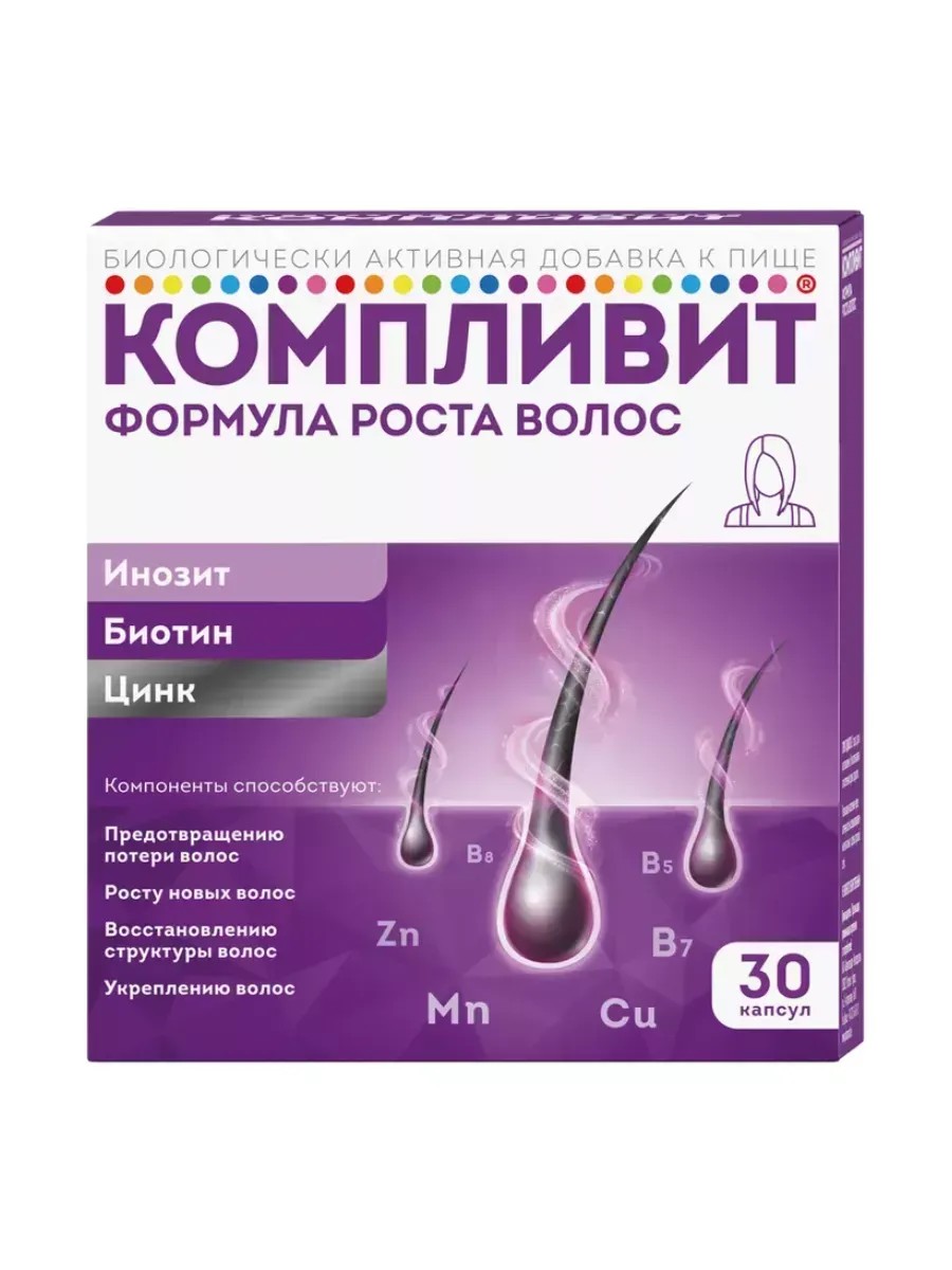 «Компливит Формула роста волос» - специализированный комплекс витаминов, минералов и биологически активных веществ, действие которых направлено против выпадения волос и способствует росту новых волос. Компоненты комплекса участвуют во всех видах обмена веществ, проявляют антиоксидантные свойства, ускоряют процессы регенерации, способствуют: Предотвращению потери волос Росту новых волос Восстановлению структуры волос Предотвращению сечения волос Поддержанию силы и упругости волоса Укреплению волос Поддержанию нормального состояния и функционирования кожи и волос Содержащийся в комплексе экстракт плодов карликовой пальмы способен блокировать действие фермента 5-альфа-редуктазы и препятствовать превращению тестостерона в дигидротестостерон, который блокирует факторы роста волос, что является частой причиной выпадения волос у женщин и облысения у мужчин. Используется для замедления потери волос, вызванной избытком дигидротестостерона.