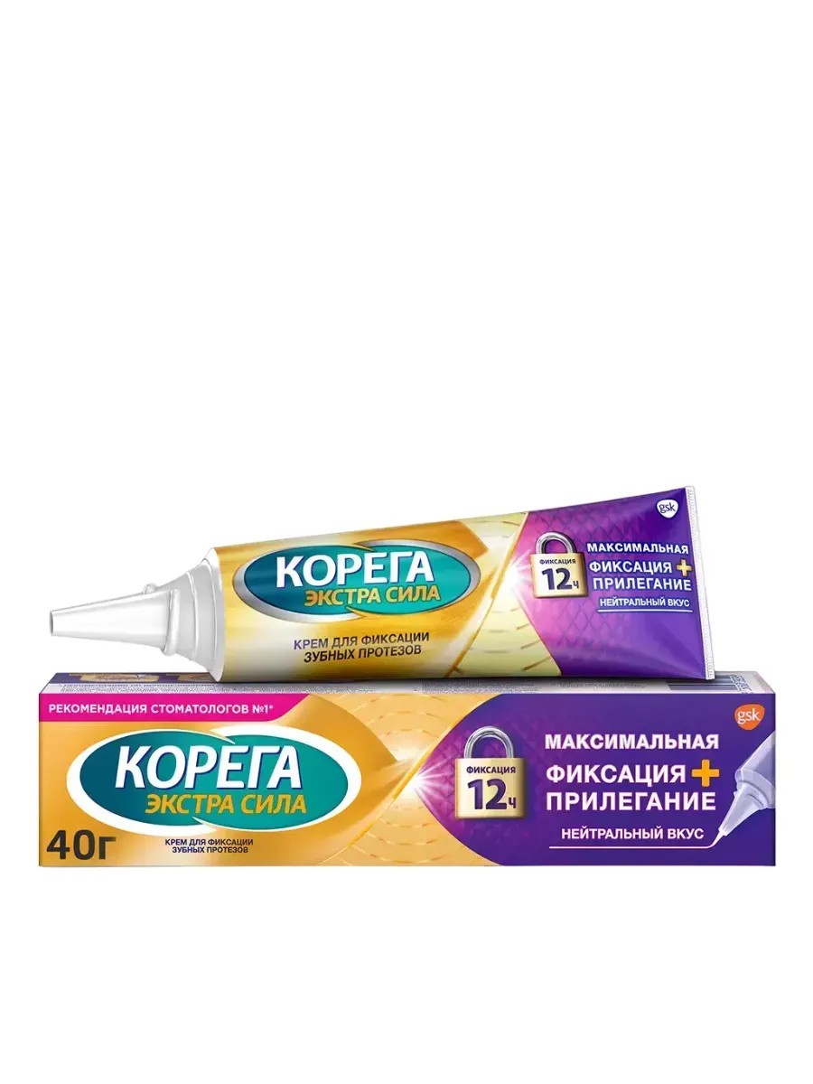 Korega for fixing dentures. Maximum adhesion and protection against food particles getting under the denture. The narrow spout ensures precise application and distribution of the cream over the entire denture surface. Ideal for partial dentures where the application area is limited. Provides long-lasting hold for up to 12 hours. Increases coverage area. Increases biting force. Contains no flavorings or additives – does not alter the taste of food.