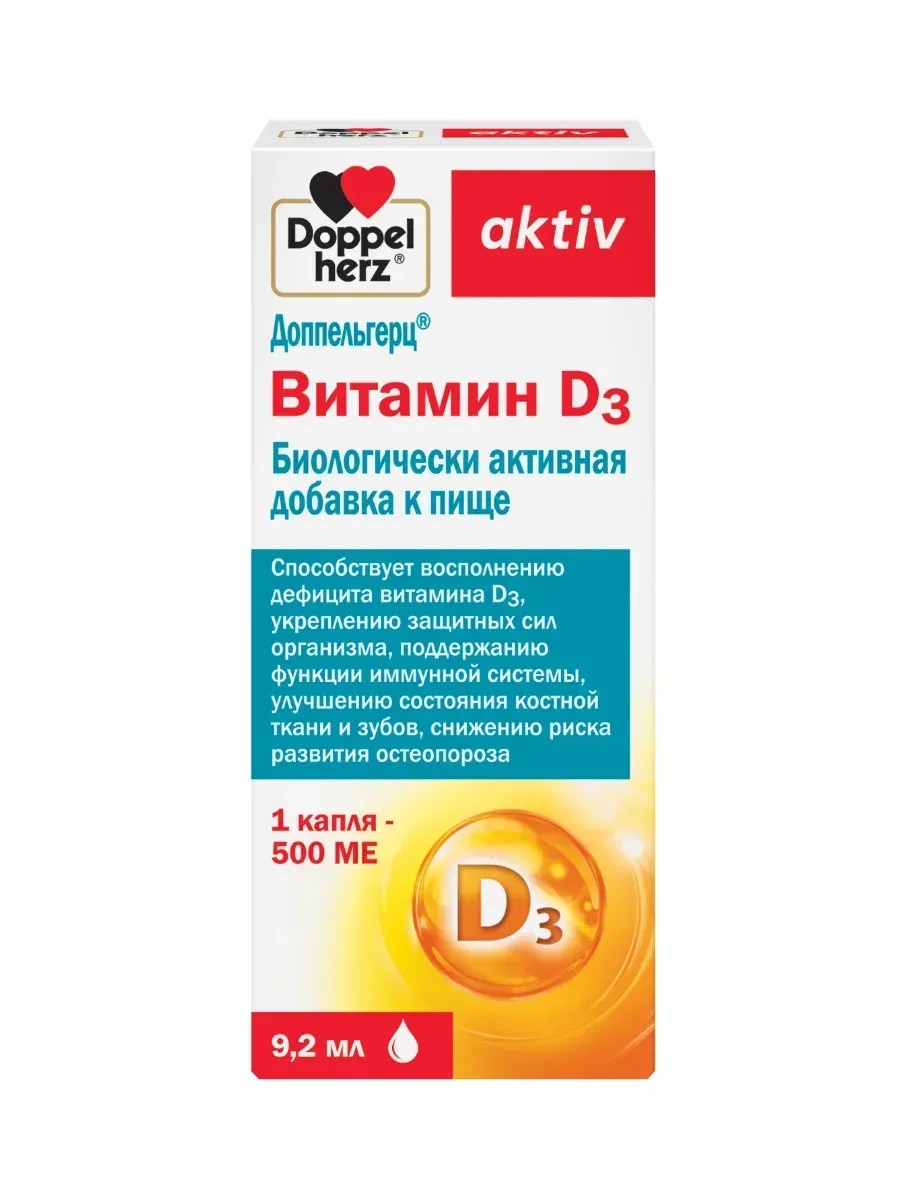 Доппельгерц актив витамин d3 9,2 мл флакон с дозатором-капельницей - это биологически активная добавка ) к пище. Способствует восполнению дефицита витамина D3, укреплению защитных сил организма, поддержанию функции иммунной системы, улучшению состояния костной ткани и зубов, снижению риска развития остеопороза 1 КАПЛЯ СОДЕРЖИТ: Витамин D3 12,5 мкг (500 МЕ) . Взрослым по 1 капле в день во время еды. Продолжительность приема - 1 месяц. При необходимости прием можно повторить. Перед применением необходимо проконсультироваться с врачом.