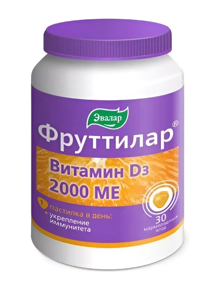 ФРУТТИЛАР Витамин D3 2000 МЕ – это биологически активная добавка к пище (БАД). Содержит 2000 МЕ витамина D3 в 1 пастилке по 4 грамма каждая. Для тех, кто хочет не только получать от витамина D3 пользу, но и порадовать себя приятным вкусом. Фруттилар Витамин D3 способствует укреплению иммунитета и снижению риска развития простудных заболеваний, лучшему усвоению кальция, укреплению костей, зубов, снижению риска развития остеопороза, повышению силы мышц, поддержанию сердечно-сосудистой и нервной систем, регуляции репродуктивной функции организма, повышению уровня серотонина – «гормона счастья» и улучшению настроения. В изготовлении мармеладной основы используются натуральные пищевые компоненты: сахар, желатин (источник коллагена) и патока. Не требуют запивания. Взрослым — по 1 жевательной пастилке в день. Продолжительность приема — 2–3 месяца. Перед применением рекомендуется проконсультироваться с врачом.