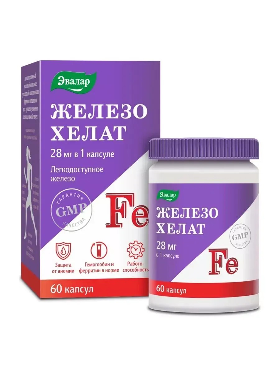 Evalar Iron Chelate is a dietary supplement, a readily available chelated complex for maximum iron absorption. Evalar Iron Chelate contains a high dose of iron (28 mg per capsule) and next-generation vitamins in coenzyme forms (vitamins C, B9, and B12) essential for better iron absorption. Evalar Iron Chelate helps maintain normal ferritin and hemoglobin levels, reduces the risk of anemia, reduces fatigue, and improves performance. It is well absorbed without gastrointestinal side effects (does not cause bloating, constipation, or diarrhea), as it does not affect stomach acidity. Adults: 1 capsule daily. Duration of treatment: at least 1 month. The course can be repeated if necessary. It is recommended to consult a doctor before use.
