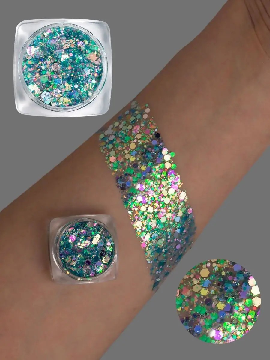 Блестки или Глиттер для лица и тела это современный тренд в декоративной косметике и быстрый способ создать яркий образ или добавить яркие блестящие детали в ваш макияж. Наши блестки можно использовать как для лица, так и для тела, чтобы создать запоминающийся арт. Используйте блестки для повседневного макияжа или для того, чтобы стать звездой вечеринки. В нашей палитре более 100 оттенков и форм глиттеров. И каждый из вариантов блесток внутри себя таит еще десятки переливов разнообразно раскрывается при дневном, искусственном или ультрафиолетовом освещении.