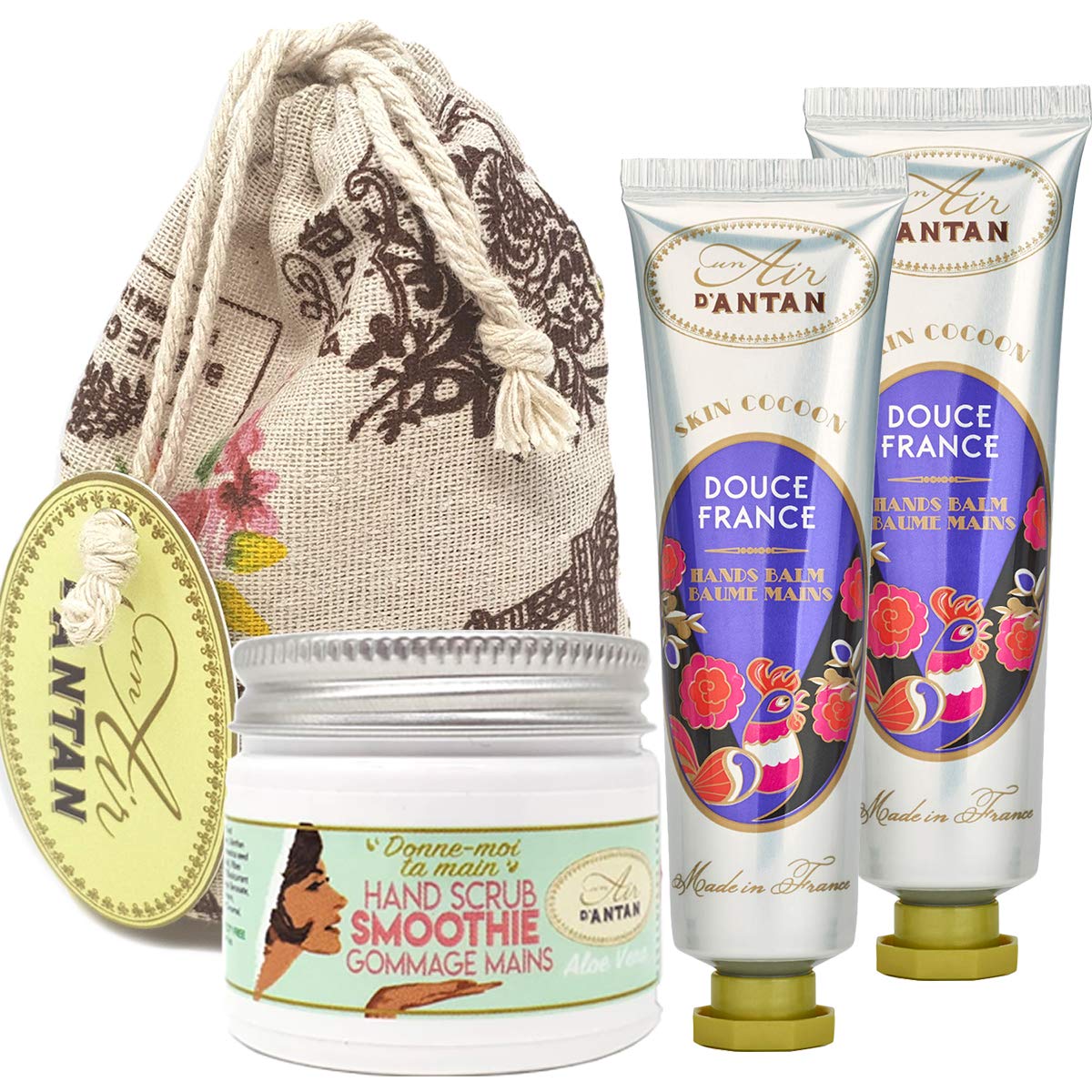UN AIR D'Attan products: gift ideas for birthday, anniversary, Christmas, Father's Day, Christmas, Christmas or a gift for women, friend, best friend, BFF, teacher, girls, women, mom, grandma, dad, men, men, Favorite person, partner, couple or to offer a personalized special small gift set.Cosmetics manufactured in France with a lot of amour.PH neutral for your skin, free of parabens and sulfates, dermatologically tested.Hand cream perfume: a delicate and nostalgic mix of almond, cowardly and vetive grass.Hand cream and nail cream: moisturizing formula with shea butter and sweet almond oil.2x25ml.This hand peeling cares for your hands incredibly tender in 2 steps step 1: the rich formula gently peeps your hands and cares intensively with moisture.Dead skin cells are removed by the pumice stone.Step 2: The complex olive oil and sweet almond oil makes your hands tender and smooth and protects them from drying out.Fragrance aloe vera.50ml.Un Air d'Antan Produkte : Geschenkideen für geburtstag, jahrestag, weihnachten, vatertag, Weihnachts, Weihnacht oder ein Geschenk für Frauen, freund, beste freundin, ihn, bff, lehrer, mädchen, damen, mama, oma, papa, männer, herren, lieblingsmensch partner, pärchen oder um eine personalisierte besondere kleine Geschenkset anzubieten. Kosmetik hergestellt in Frankreich mit viel Amour. PH neutral für Ihre Haut, frei von Parabenen und Sulfaten, dermatologisch getestet. Handcreme Parfüm : Eine zarte und nostalgische Mischung aus Mandel, Feige und Vetivergras. Handcreme und Nagelcreme : Feuchtigkeitsspendende Formel mit Shea butter und süßem Mandelöl. 2x25ml. Diese Handpeeling pflegt Ihre Hände unglaublich zart in 2 Schritten Schritt 1 : Die reichhaltige Formel peelt sanft die Hände und versorgt sie intensiv mit Feuchtigkeit. Durch die Bimsstein werden abgestorbene Hautschüppchen entfernt. Schritt 2 : das komplexe Olivenöl und Süßmandelöl macht die Hände zart und geschmeidig und schützt sie vor dem Austrocknen. Duft Aloe Vera. 50ml.Beauty Set Set DOUCE Für Frauen. Handcremes 50ml Mit Sheabutter Und Süßem Mandelöl 2x25ml In Einem Schönen Jutebeutel.Air D'Antan Duft: Mandel, Feige Pflegeset Damen Wellness Geschenkset Mandel und Feige