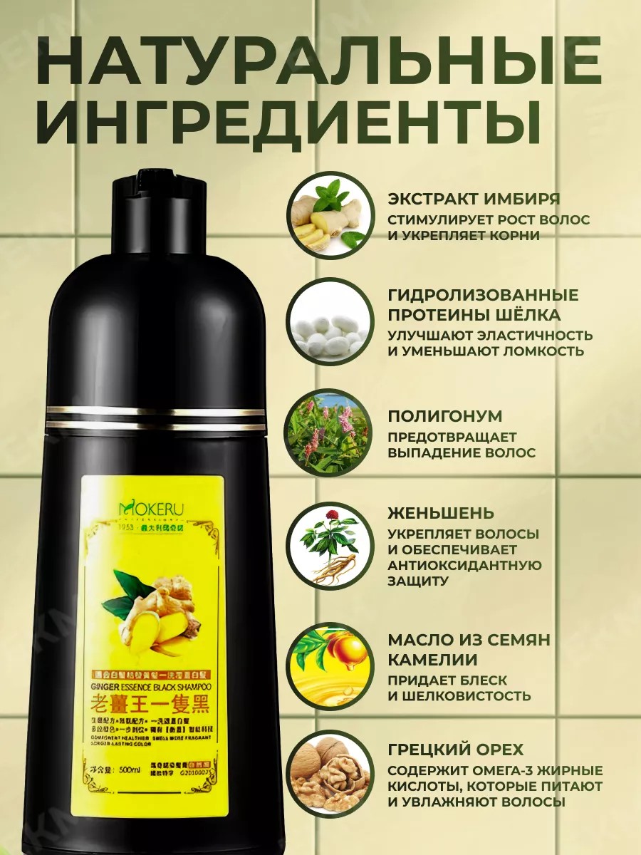 Профессиональный имбирный шампунь Мокеru предназначен для быстрого 100% окрашивания седых волос (5 - 10 мин). Цвет - Натуральный чёрный. Цвет сохраняется до 6 месяцев! Имеет приятный запах масел и имбиря. Подарит вашим волосам естественный насыщенный цвет, великолепный блеск и объем от корней. Экономичной упаковки 500 мл хватит до 30 применений, в зависимости от длины волос. Также подходит мужчинам для окрашивания волос на голове и коже лица. Способ применения: (!) Перед использованием проведите аллерготест.1. Рекомендуется использовать Mokeru на сухие волосы. 2. Наденьте перчатки (упакованные внутри). 3. Выдавите на ладони желаемое количество шампуня - краски для волос, хорошо перемешайте и нанесите на волосы. 4. Хорошо помассируйте волосы в течение 5 минут, пока шампунь не распределится равномерно по волосам и коже головы. 5. Подождите ещё 5-20 минут, ( чем дольше, тем интенсивнее цвет) затем хорошо промойте водой, можно с использованием обычного шампуня.