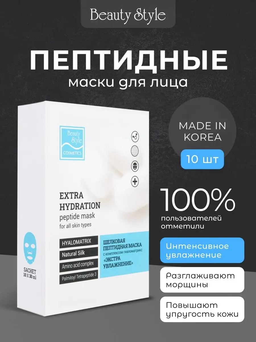 Корейская тканевая маска для лица Beauty Style - пять форм гиалуроновой кислоты в сочетании с аминокислотами и тетра-пептидом для всеобъемлющего увлажнения и укрепления кожи любого типа. Увлажняющая тканевая маска поддерживает упругость и эластичность кожи и оказывает легкое подтягивающее действие. Набор предназначен для восстановления уровня влаги, замедления процессов старения и поддержания иммунной защиты кожи, насыщенную комплексом Гиаломатрикс из 5 видов гиалуроновой кислоты. Действие гиалуронки усиливают и дополняют экстракт шелка, тетрапептид ригин и аминокислоты, делающие кожу упругой и гладкой. Тканевая маска для лица Корея помогает устранить признаки дегидратации после длительного воздействия на кожу сухого воздуха, после перелетов и травмирующих воздействий внешних стрессоров, а также оказывает профилактическое действие против преждевременного старения. Экспресс-уход рекомендован для молодой и зрелой кожи, начиная с 25 лет. В наибольшей степени шелковая пептидная тканевая маска для лица подойдет для сухой кожи, при повышенной чувствительности и первых признаках старения.