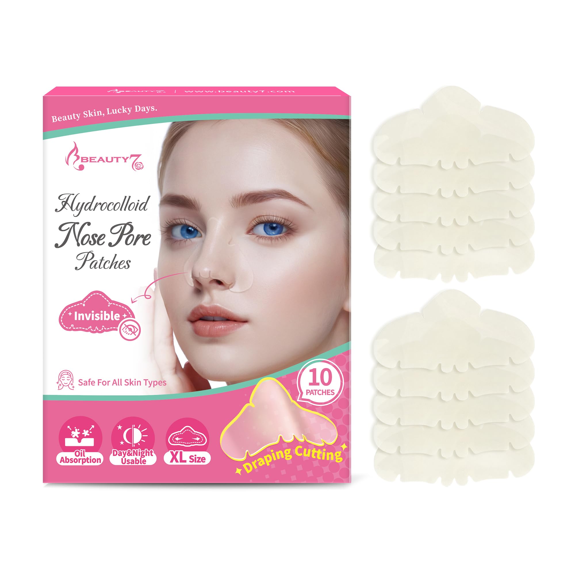 Hydrocolloid nasal plasters, non-irritating, with good physical adsorption, high efficacy, and no pain. Unclog shrink pores, absorb oil, and eliminate blackheads.Cleanse and dry your skin thoroughly. Apply the patch: smooth the patch onto your nose, starting from the middle. Remove after 6 to 8 hours or overnight. Remove the patch: the patch will fill with white mucus. The absorbent hydrocolloid gel gently absorbs mucus from your pores, leaving your nose cleaner overnight. It can reduce the appearance of acne, pores, and oil in 6 to 8 hours. It absorbs excess oil from pores and acne. Pores look cleaner and firmer after application. With Beauty7 Hydrocolloid Nose Patches, an XL hydrocolloid patch with viscous absorption that easily treats pores and acne buildup, your skin will be clearer in 6 hours. Effective against acne and oily pores. Hydrocolloid, a natural material, absorbs secretions and effectively absorbs mucus from pores and acne. Hydrocolloid nasal dressings, non-irritating, with good physical adsorption, high efficacy, and no pain. They unclog and shrink pores, absorb oil, and eliminate blackheads.Beauty7 Lot de 10 bandes adhésives hydrocolloïdes XL pour enlever les points noirs et les points noirs - Absorbe l'huile et les points noirsDESCRIPTION DU PRODUIT Pansements nasaux hydrocolloïdes, non irritants, bonne adsorption physique, haute efficacité, sans douleur. Les pores Unclog Shrink absorbent l'huile, éliminent les points noirs.Nettoyez la peau et séchez-la complètement. Appliquer le pansement : passer le patch sur le nez en partant du milieu. Retirer après 6 à 8 heures ou toute la nuit. Enlever le pansement : le pansement se remplira de mucus blanc. Le gel hydrocolloïde absorbant absorbe doucement le mucus des pores et rend votre nez plus propre pendant la nuit. Peut réduire l'apparence de l'acné, des pores et de l'huile en 6 à 8 heures. Absorbe l'excès d'huile des pores et de l'acné. Les pores ont l'air plus propres et plus fermes après l'application. Avec Beauty7 Hydrocolloïde Nose Patches, un pansement hydrocolloïde XL à absorption visqueuse qui traite facilement les pores et l'accumulation d'acné, la peau sera plus claire en 6 heures. Efficace contre l'acné et les pores gras. Hydrocolloïde, un matériau naturel absorbant les sécrétions et absorbe efficacement le mucus des pores et de l'acné. Pansements nasaux hydrocolloïdes, non irritants, bonne adsorption physique, haute efficacité, sans douleur. Les pores Unclog Shrink absorbent l'huile, éliminent les points noirs.
