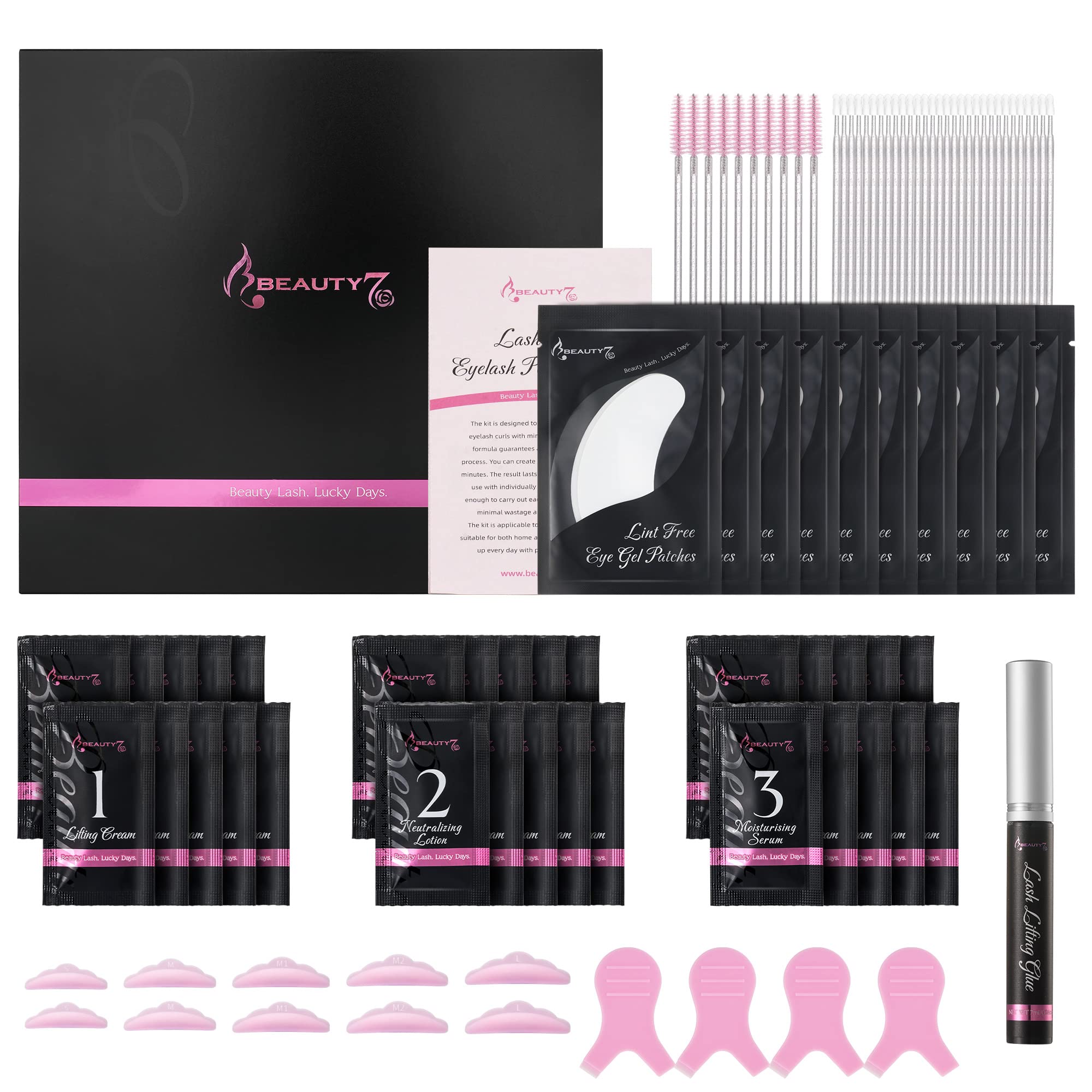 Directions: 1. Cleanse the eye area. 2. Apply eye gel pads to cover the lower lashes. 3. Apply eyelash adhesive to the back of the silicone pads and hold for 30 seconds. Then, stick the pads to the edge of the upper eyelids and press lightly for 5 to 10 seconds until firmly adhered. 4. Apply eyelash adhesive to the silicone pads and hold for 30 seconds until the adhesive is semi-dry and works best. With the flat end of the lifting stick, lift the upper lashes from root to tip and stick them to the silicone pads. Then, use the pointed end to pick up and separate the lashes on the silicone pads. 5. Use a micro-brush to apply 1 to the lashes. Leave a 2 mm safety distance from the lash line and wait 4 to 7 minutes. (If possible, cover with plastic wrap to shorten the waiting time.) 6. Use the flat end of the lifting stick to remove 1. Use a micro-brush to apply 2 to the lashes, leaving a 2 mm gap from the lash line, and wait 4-7 minutes. (You can also shorten the waiting time with plastic wrap.) If the lashes become uneven when removing 1, please repeat step 4. Refill with glue and comb the lashes again. 7. Use the flat end of the lifting stick to remove 2, then remove the silicone pads and gel pads. 8. Wash the eye area with warm water and facial cleanser to remove any glue residue. (You can use makeup remover and cotton pads to quickly remove any remaining glue.) 9. Apply mascara evenly to the lashes. 10. Complete.The perfect gift: The Eyelash Lift Kit is an innovative method for making eyelashes curl and look younger. Before using the eyelash lifting kit for the first time, perform a patch test on your eyelids. Easy to Use Improved formula – Reduced processing time. Our eyelash lifting kit takes only 4 minutes, compared to 10 minutes for traditional methods. Individually packaged for convenience and hygiene. The product includes easy-to-understand and easy-to-use sequence labels and instruction manuals. Safety Our eyelash lifting kit has passed rigorous safety and efficacy tests. It is gentle and non-irritating, suitable for DIY or salon use (please strictly follow the instructions for use do not use independently). Large Capacity The eyelash lifting kit can be used 10 times. This eyelash kit is suitable for all styles, from parties and weddings to everyday makeup. Long-lasting 12-week effect – The lash lift kit curls lashes for up to 12 weeks in just one application. The lash lift creates the perfect curl, making your eyes look bigger and more captivating. No need to worry about using an eyelash curler every day. No more false eyelashes. Let the curl look natural.Beauty7 Lash Lifting Kit de lifting pour cils - Kit d'extension de cils - Kit de lifting - Gel lifting - Kit de lifting pour sourcils - Kit de lifting - Kit de lifting - Kit de lifting - Kit de lifting - Kit de lifting - Kit de lifting - Pour le bricolage - 10DESCRIPTION DU PRODUIT Utilisation : 1. Nettoyez le contour des yeux. 2. Appliquez des coussinets de gel pour les yeux pour couvrir les cils inférieurs. 3. Appliquez la colle à cils sur le dos des pansements en silicone et maintenez-la pendant 30 secondes, puis collez-la sur le bord des paupières supérieures et appuyez légèrement pendant 5 à 10 secondes jusqu'à ce qu'ils adhèrent fermement. 4. Appliquez la colle à cils sur les pansements en silicone et maintenez pendant 30 secondes jusqu'à ce que la colle soit semi-sèche et fonctionne mieux. Avec l'extrémité plate du bâton de lifting, soulevez les cils supérieurs de la racine à la pointe et collez-les sur les pansements en silicone, puis utilisez l'extrémité pointue pour ramasser et partager les cils sur les pansements en silicone. 5. Utilisez une micro-brosse pour appliquer 1 sur les cils. Laissez une distance de sécurité de 2 mm de la racine des cils et attendez 4 à 7 minutes. (Si possible, couvrir avec un film plastique pour raccourcir le temps d'attente). 6. Utilisez l'extrémité plate du bâton de lifting pour enlever le numéro 1. Utilisez une micro-brosse pour appliquer le numéro 2 sur les cils, en laissant une distance de 2 mm de la couronne des cils et en attendre 4-7 minutes. (également possible de raccourcir le temps d'attente avec un film de conservation) Si les cils deviennent incorrects lors de l'essuyage 1, veuillez répéter l'étape 4. Remplissez la colle et peignez à nouveau les cils. 7. Utilisez l'extrémité plate du lift pour essuyer le numéro 2, puis retirez les patchs en silicone et les coussinets en gel. 8. Lavez le contour des yeux avec de l'eau tiède et du nettoyant pour le visage pour enlever les résidus de colle. (Vous pouvez utiliser du démaquillant et du coton pour enlever rapidement les résidus de colle). 9. Appliquer le pinceau à mascara uniformément sur les cils. 10. Complète.Le cadeau parfait : le kit Eyelash Lift est une méthode innovante pour rendre les cils bouclés et plus jeunes. Avant d'utiliser le kit de lifting à cils pour la première fois, effectuez un test de peau sur les paupières. Facile à utiliser Formule améliorée – Temps d'action réduit. Notre kit d'extension de cils Lifting ne prend que 4 minutes et prend 10 minutes de temps traditionnel. Emballage indépendant, pratique et hygiénique. Le produit comprend des étiquettes de séquence et des manuels d'utilisation très faciles à comprendre et à utiliser. Sécurité Notre kit d'ondulation de cils a passé des tests de sécurité et d'efficacité rigoureux. Il est doux et peu irritant, adapté pour le bricolage ou le salon (veuillez respecter strictement les instructions d'utilisation et d'utilisation (français non garanti), ne pas utiliser seulement). Grande capacité Le kit de lifting pour cils peut être utilisé 10 fois. Ce kit de cils est adapté pour tous les styles de fêtes, de mariages et de maquillage quotidien. Longue durée de 12 semaines - Le kit de lifting pour cils fait boucler les cils pendant 12 semaines en une seule application. Le lifting de cils forme la bo