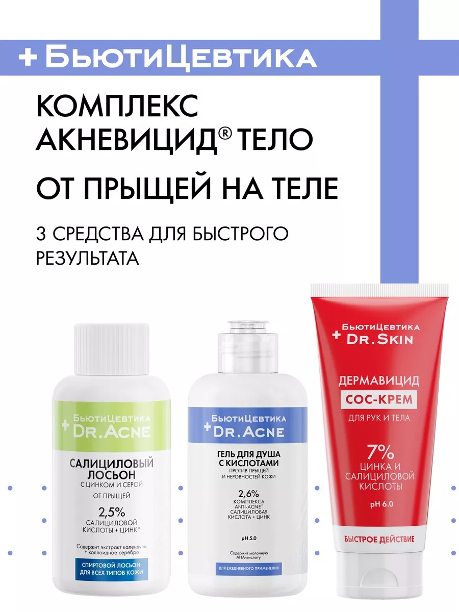 | Комплектация | Салициловый лосьон с цинком и серой; Гель для душа от прыщей и неровностей кожи; SOS крем для тела от прыщей с салициловой кислотой и цинком |