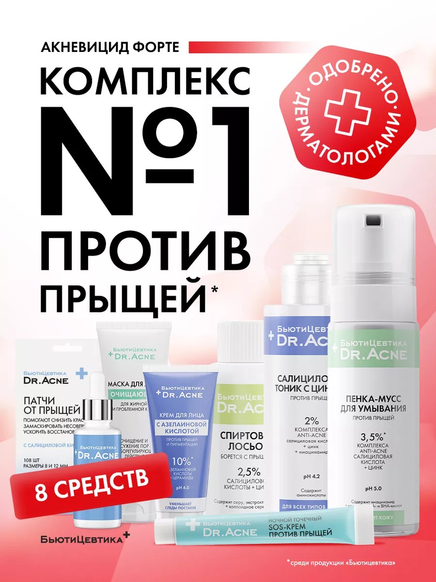 Набор "Акневицид Форте" – это комплексное решение для борьбы с прыщами, акне, идеально подходящее как для взрослых, так и для подростков. В состав входят: пенка - умывалка с салициловой кислотой, очищающий салициловый тоник - тонер без спирта, спиртовой лосьон, средство от воспалений, легкий увлажняющий дневной крем, сыворотка от прыщей, маска для лица с серой и цинком сужающая поры, а также наклейки от прыщей. Эти средства разработаны для проблемной, чувствительной, жирной и комбинированной, сухой кожи, обеспечивая качественный уход и видимый результат.