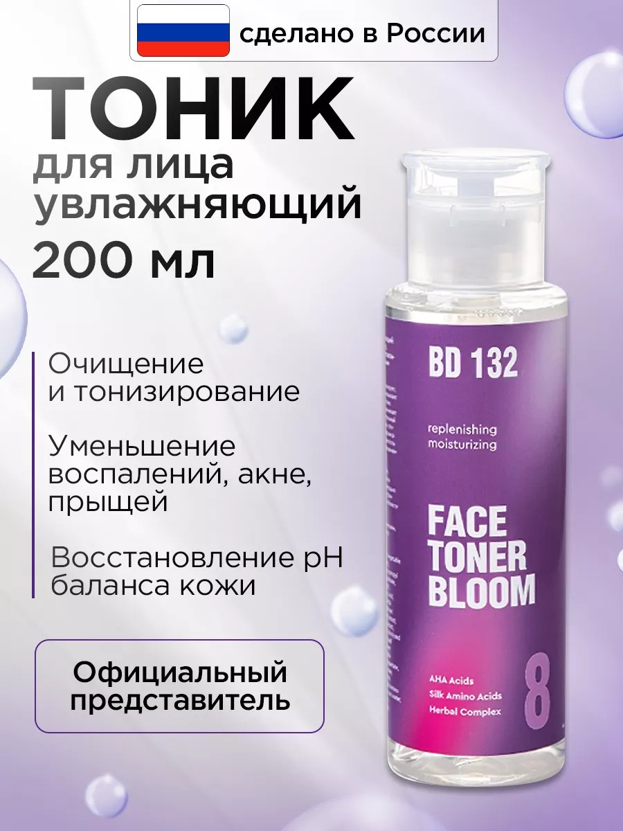 Средство для очищения, восстановления баланса и тонизирования кожи. Объем (мл): 200.00 мл. BEAUTYDRUGS BD 132 Увлажняющий тоник для лица BLOOM FACE TONER - это превосходный многоцелевой продукт, разработанный для улучшения кожи лица.Тоник для лица обогащен растительными компонентами:- экстракт цветов ромашки.- экстракт календулы.- экстракт мелиссы.- сок листье Алое Вера.- аминокислоты шёлка.- экстракт корня женьшеня.- экстракт лемонграсса.- экстракт лепестков дамассой розы.Тоник идеально подходит для решения задач:- очищение.- тонизирование.- восстановление pH баланса кожи.- увлажнение.- уменьшение воспалений, акне, прыщей.- сужает открытые поры, уменьшает угревую сыпь.- разглаживает и выравнивает тон кожи.- восстанавливает естественный баланс ph кожи.
