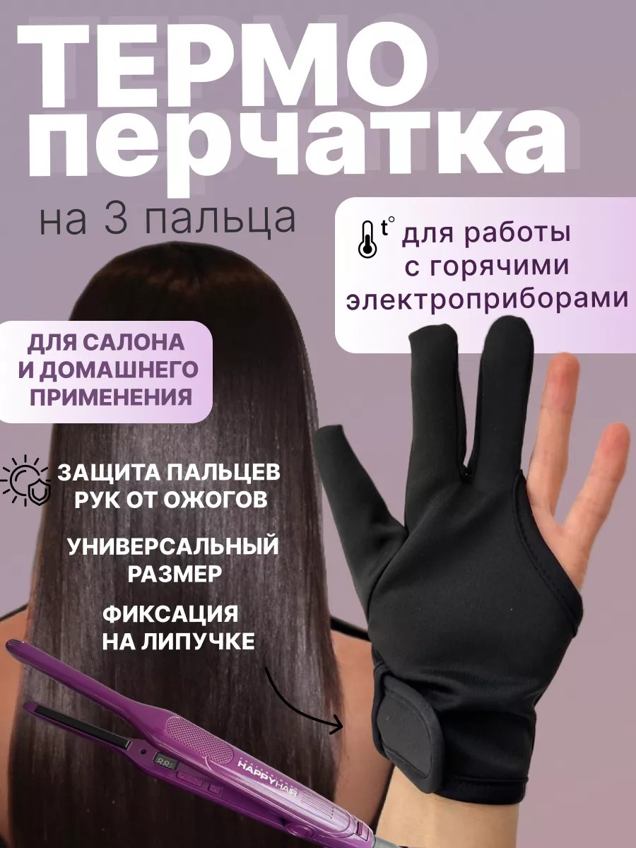 Термоперчатка для парикмахера для работы с горячими инструментами имеет три пальца, защищающие от ожогов, и удобный ремешок для запястья.