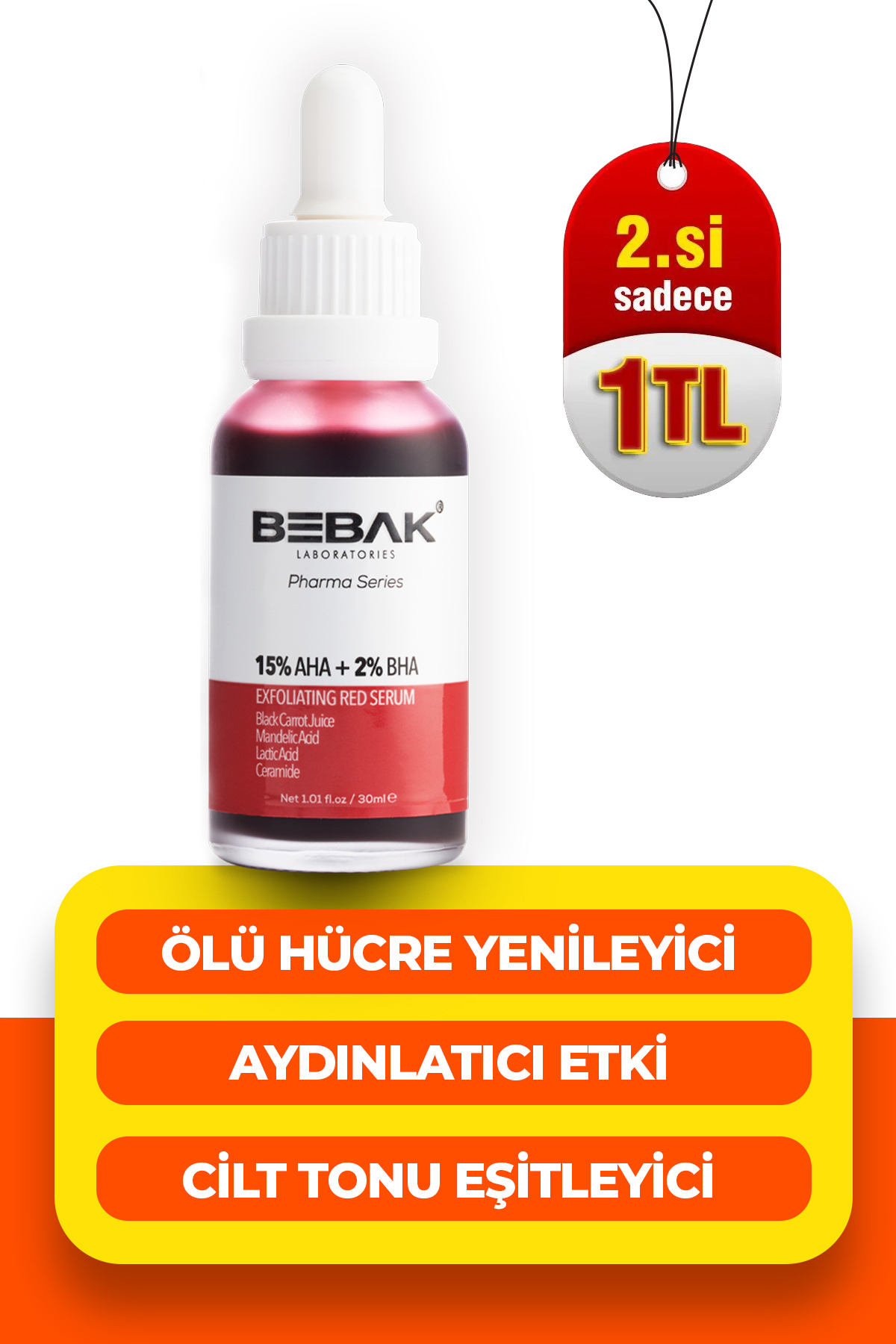 BebakPharma Skin Tone Equalizer Red Peeling Serum 15 AHA-2 BHAIt helps refresh and renew the skin by peeling the skin surface with Alpha Hydroxy Acid and Beta Hydroxy Acid in its formula. Its special formula, reinforced with Ceramide and Postbiotics, protects the skin and fights against harmful external factors.