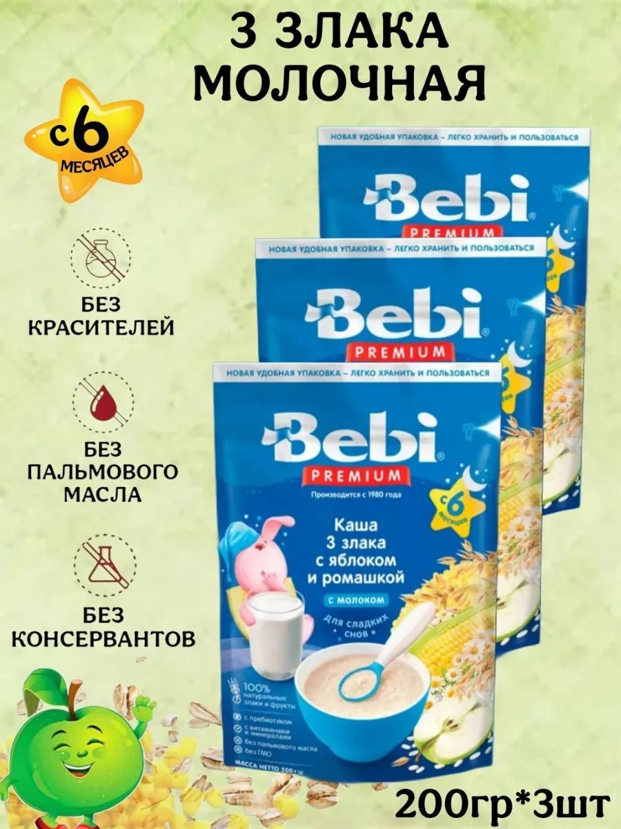 Bebi Premium Каша молочная 3 злака яблоко-ромашка, 6 месяца, 200г, 3шт