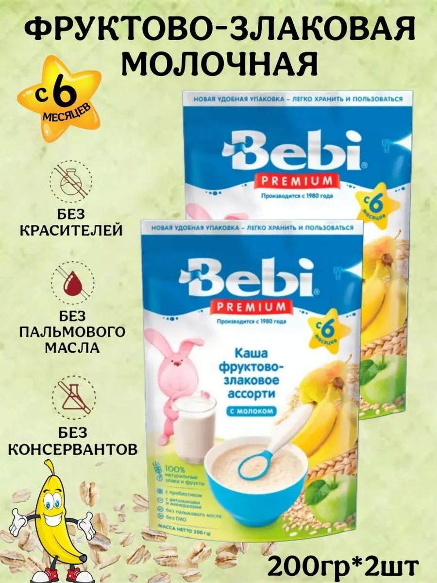Bebi Premium Каша молочная-фруктово-злаковое ассорти, 6 месяца, 200г, 2шт