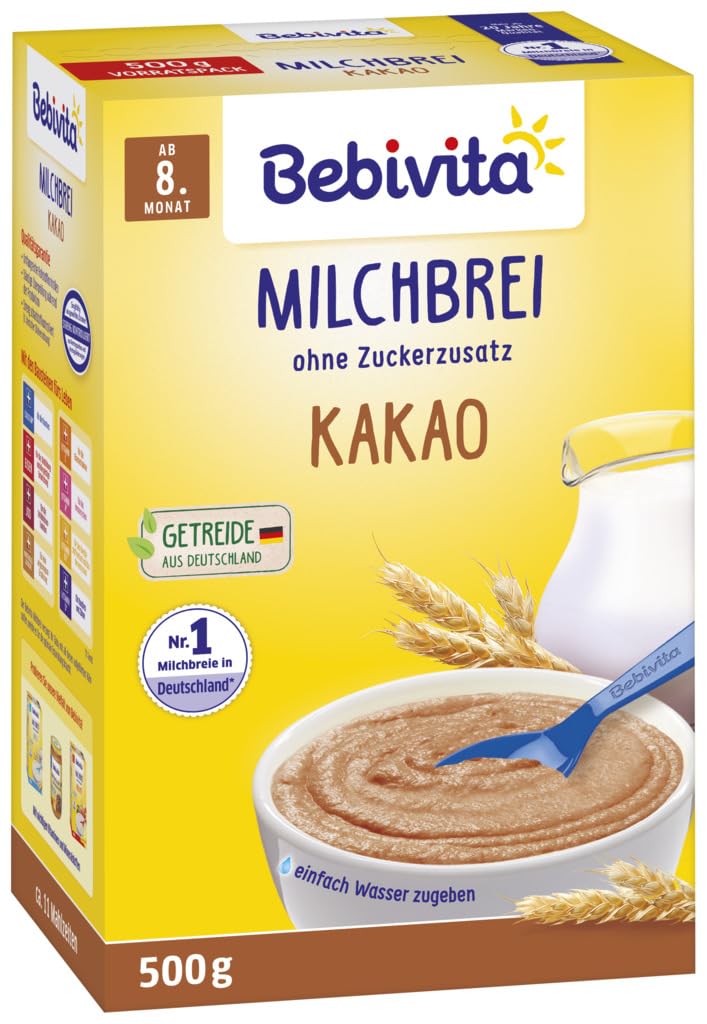 Bebivita milk porridge cocoa contains important minerals and vitamins that positively influence the spiritual and physical development of their child.The dairy porridge makes your child satisfy.A delicate cocoaote guarantees a fine taste experience and is suitable for kindergarten age.Without added sugar and without a sweet juice concentrates. Ingredients / ingredients Molken product, wheat semolina, 16% skimmed milk powder, vegetable oil (sunflower oil, rapeseed oil, coconut oil), 2.7% cocoa powder, calcium carbonate, iron diphosphate, vitamin C, vitamin E, vitamin B1, vitamin A, vitamin D), potassium yodate. Instructions Store dry and out of heat.Always close the opened pack well and use it up within 3 weeks. Address manufacturer/importer Bebivita GmbH / D-85276 rice More contains valuable nutrients for healthy growth. Bebivita Milchbrei Kakao enthält wichtige Mineralstoffe und Vitamine, die die geistige und körperliche Entwicklung Ihres Kindes positiv beeinflussen. Abgestimmt auf das Alter Ihres Kindes lässt der Milchbrei Ihr Kind wohlig satt werden. Eine zarte Kakaonote garantiert ein feines Geschmackserlebnis und eignet sich bis ins Kindergartenalter. Ohne Zuckerzusatz und ohne süßende Saftkonzentrate. INHALTSSTOFFE / ZUTATEN Molkenerzeugnis, Weizengrieß, 16% Magermilchpulver, pflanzliche Öle (Sonnenblumenöl, Rapsöl, Kokosöl), 2,7% Kakaopulver, Calciumcarbonat, Eisendiphosphat, Vitaminmischung (Vitamin C, Vitamin E, Vitamin B1, Vitamin A, Vitamin D), Kaliumjodat. GEBRAUCHSANWEISUNG Vor Wärme geschützt und trocken lagern. Angebrochene Packung stets gut wieder verschließen und innerhalb von 3 Wochen aufbrauchen. ANSCHRIFT HERSTELLER/IMPORTEUR Bebivita GmbH / D-85276 Reisgang Mehrenthält wertvolle Nährstoffe für ein gesundes Wachstum.Bebivita Milchbrei Kakao ab dem 8. Monat, ohne Zuckerzusatz, 2er Pack (2 x 500g)