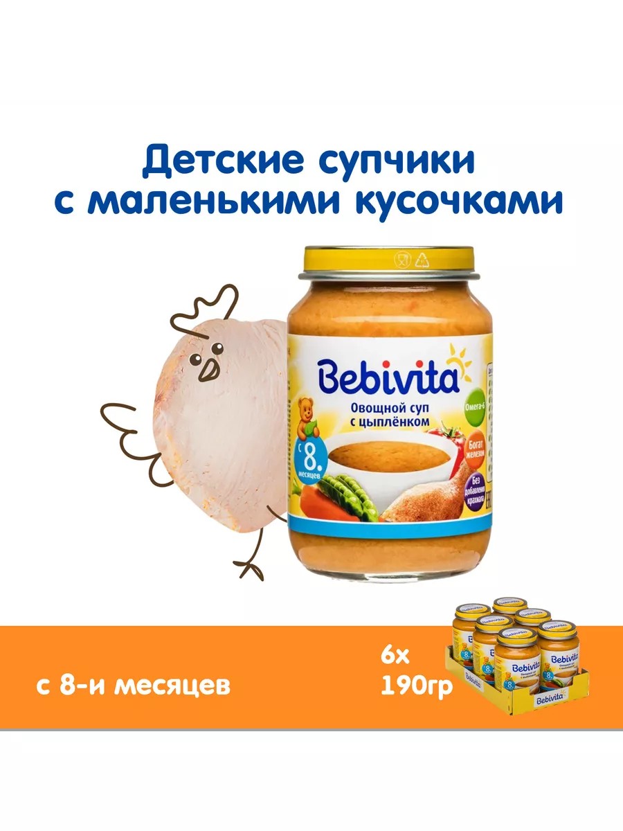 Bebivita Пюре с кусочками "Суп с цыпленком", с 8 мес, 6х190г