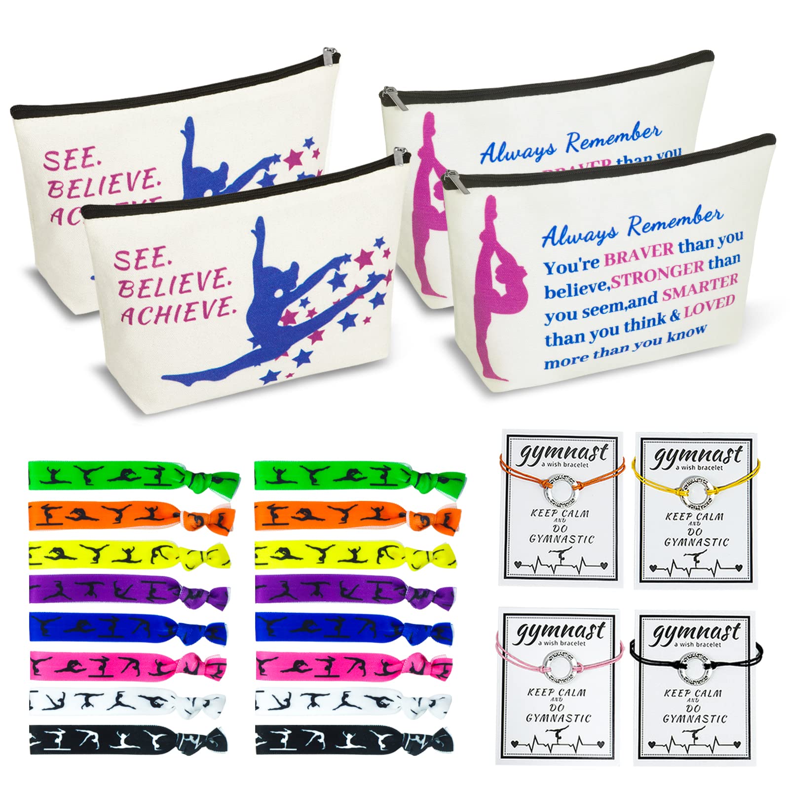 Customer Services:If you have any question, please feel free to contact us first, we will respond to you within 24 hours. In order to satisfy our customers, we will try our best to resolve any problems. BLESSING CARD BRACELETS:The idea behind a wish bracelet is that you make a wish and put the bracelet on your wrist, and eventually when the cord wears out and breaks, your wish is released and will come true. What is your wish in 2022?. GYMNASTICS HAIR TIES:Soft, Bright, Colorful. 8 colors, 2 of each color, so you can pick the color you like depending on your mood or your fashion style. With good Elasticity. It is Great to be used as a hair ties- cinch free, and can also be used as a wrist band, bracelet or accessory. GYMNASTICS COSMETIC BAGS:Made of soft Canvas, Exquisite Workmanship, Strong Zipper, Double-sided Printing, Using imported ink which is Highly Color Fastness. Size 7.5''x5.7''x2.2'', which can store your cosmetics, odds and ends easily. GYMNASTICS GIFTS FOR GIRLS:4 Gymnastics Cosmetic Bags + 4 Gymnastics Blessing Card Bracelets + 16 Girls Gymnastics Hair Ties, Full of Content and Personality. Perfect Gift for Gymnasts, Gymnastics Teams, Gymnastic Coaches, Gymnastics Enthusiasts.Strap Type: Shoulder. Closure Type: Drawstring, Zipper. Style: See.believe.achieve. Material: Canvas. Color: Beige, Black. Brand: BEDSIFV. Best Sellers Rank: #41,624 in Sports & Outdoors. Customer Reviews: 4.6 out of 5 stars 8 ratings 4.6 out of 5 stars. Item model number: mbl05. Country of Origin: China. : B09XV3Q69P. Department: Girls. Item Weight: 7.4 ounces. Package Dimensions: 9.13 x 6.3 x 1.22 inches.