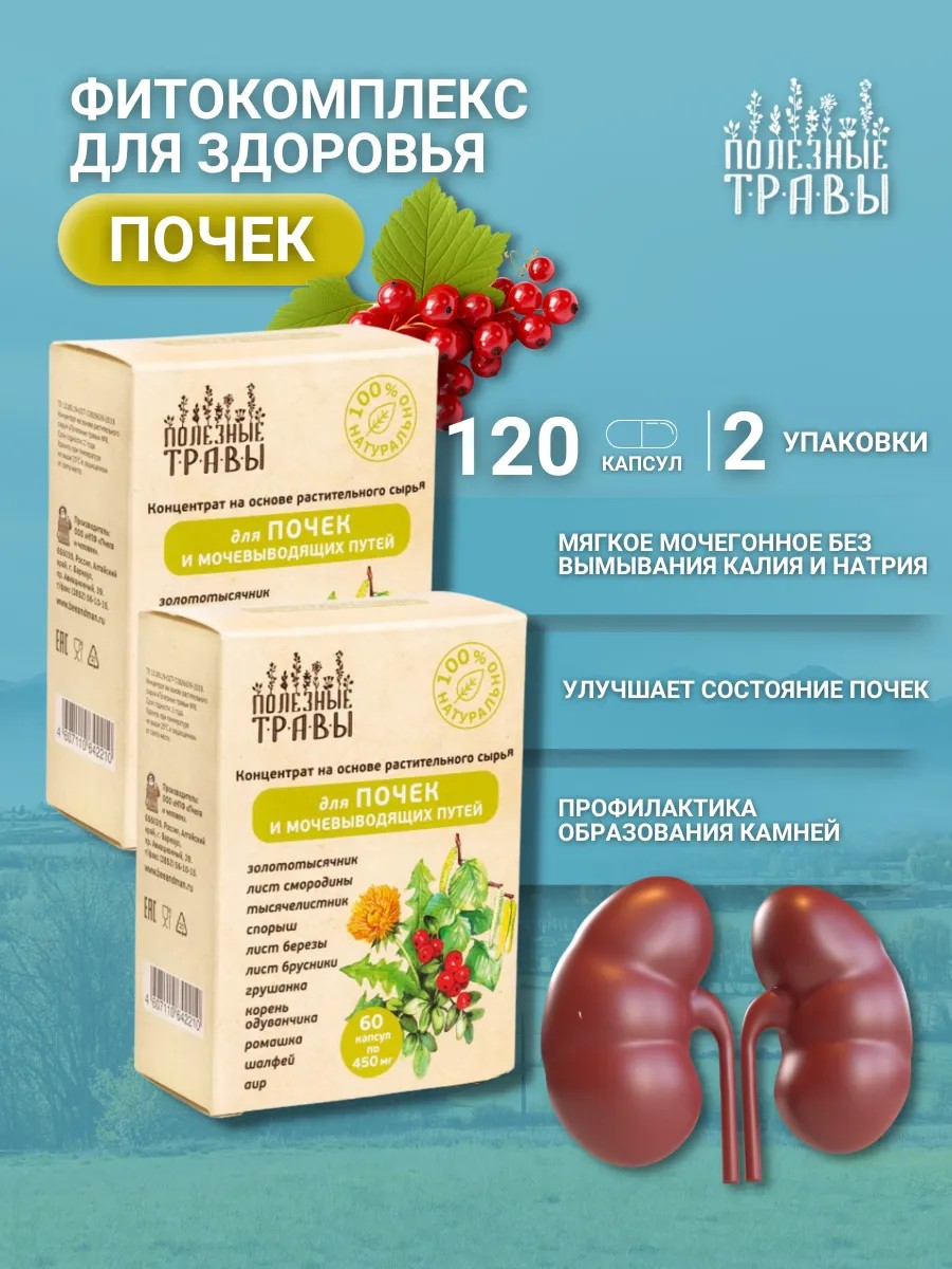 Восстановите здоровье своих почек с помощью травяного сбора в капсулах от алтайской компании "Пчела и Человек"! Этот мощный натуральный комплекс, созданный из тщательно подобранных трав, станет вашим верным помощником в поддержании здоровья мочевыделительной системы. Брусника, береза и грушанка, спорыш, смородина, одуванчик и другие известные своими целебными свойствами травки, мягко очищают почки, способствуют улучшению функционального состояния мочевыделительной системы и оказывают мягкий мочегонный эффект без вымывания калия и натрия. Регулярное употребление сбора поможет снять спазмы гладких мышц мочевыводящих путей, снизить отечность и предотвратить образование камней в почках. Способ применения и полный спектр действия подробно описаны на прилагаемых изображениях карточки товара и в прилагаемой инструкции. Желаем Вам сибирского здоровья и активного долголетия!