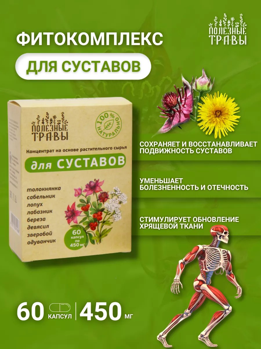 При заболеваниях опорно-двигательного аппарата таких как остеохондроз, артрит, полиартрит, артроз, ревматизм, подагра, радикулит, переломы, растяжения отлично помогают лечебные травы. Представляем Вам уникальный продукт - фитокомплекс для здоровья суставов в капсулах от известной Алтайской фирмы «Пчела и Человек» из уже полюбившейся многим серии «Полезные травы». Технологии низкотемпературных экстракций природного сырья из экологически чистых мест Алтая делает продукты серии очень эффективными. Суставной сбор направленно восстанавливает и сохраняет подвижность суставов, снимает воспаление, боль и отечность, улучшает кровообращение в области суставов, способствуя обновлению хрящевой ткани, и уменьшает риск отложения солей. Сбор алтайских трав препятствует возрастным дегенеративным изменениям и деформации суставов, позволяет увеличивать физическую нагрузку на суставы и быстрее восстанавливаться после травм, в том числе для спортсменов, что делает его полезным в любом возрасте. Обладая противовоспалительным, болеутоляющим, противомикробным и мочегонным действием, травки укрепляют иммунитет и благотворно воздействуют на весь организм. Капсулы принимают 3 раза в день во время еды, что делает курс лечения комфортным.