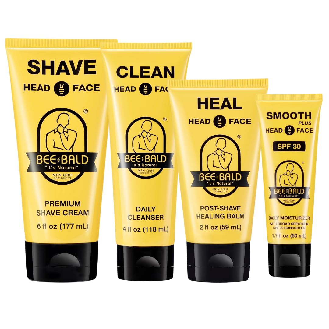 BEE BALD: Our line of premium quality skincare products was developed to offer head-shavers and the people who love them affordable, effective shaving and grooming solutions. Fortified with honey, bee pollen, and natural botanicals, our products deliver exceptional results from pre-shave prep to post-shave care. CLEAN - HYDRATING FACIAL CLEANSER: Use Bee Bald CLEAN to keep your head and face looking and feeling great. This daily cleanser gently scrubs away dry, flaky skin leaving a fresh tingling sensation and an invigorating clean smell behind. HEAL - IMMEDIATE RELIEF: Make your skin go "aaah". Our men's aftershave balm is specially formulated to calm irritated skin on the spot. With a clean, invigorating feel right away, HEAL will transform your shaving routine into a shaving retreat. SHAVE - EASY-TO-USE: With minimal lather and a lightweight feel, our shaving cream goes on light and slick for a shave that's incredibly smooth and quick. SMOOTH PLUS - DAILY HEAD AND FACIAL MOISTURIZER WITH SPF 30: Protect, enrich, and experience vibrant, healthy skin. Our men's face lotion is specially formulated to tone and hydrate for unbelievably smooth, incredibly soft skin day in and day out.