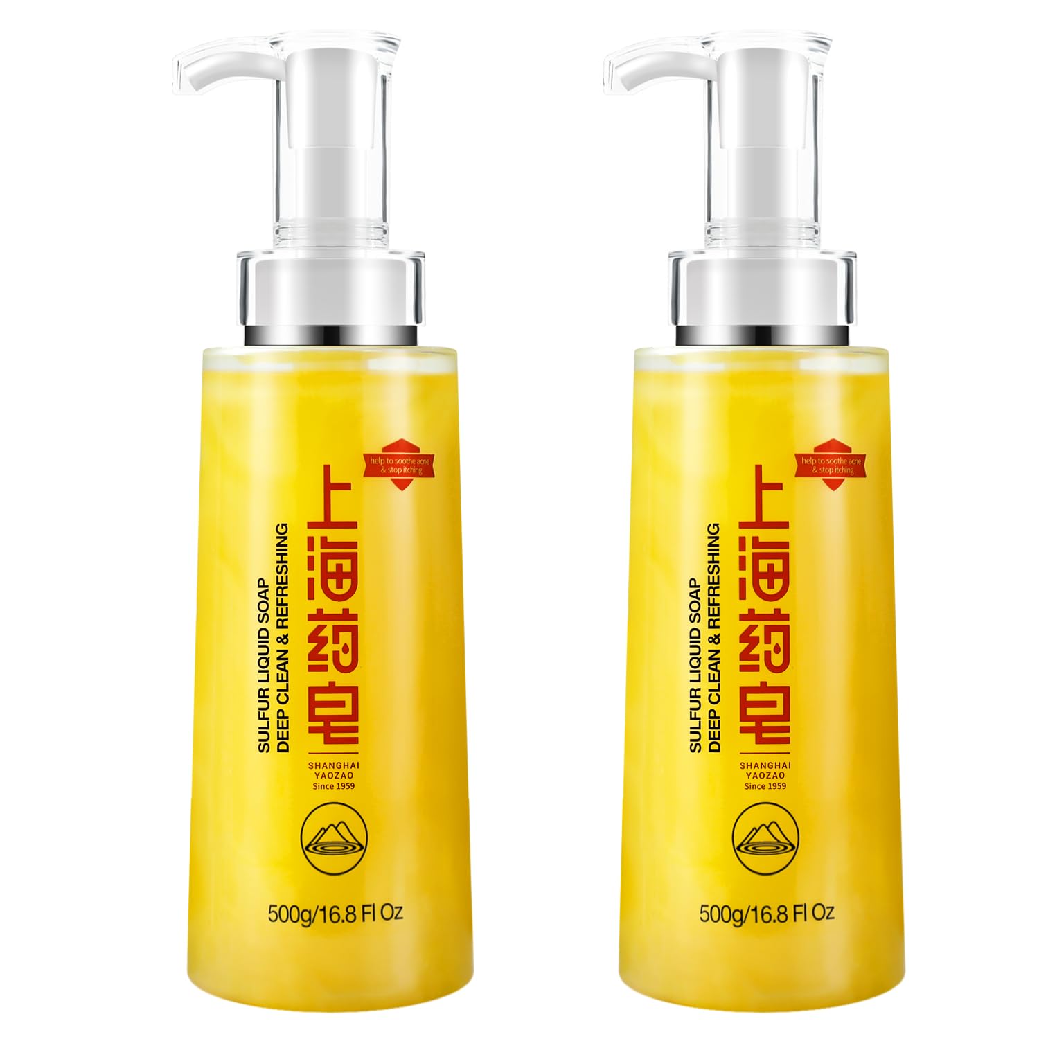 IDEAL FOR FAMILY USE: Each bottle contains 16.8 Fl Oz(500g), total 2 bottles in one set, for family daily use. Our sulfur soap does not have a powerful scent and does not require lots of water to rinse off. Recommend to use this liquid soap in conjunction with a soap-saver pouch for double lathering purpose. If your feel any discomfort, please stop using and contact us for getting a satisfactory solution. GENTLE ON SKIN: Suitable for almost all skin types, especially oily, combination, acne skin. This sulfur soap liquid is relatively mild cleanse skin and remove trapped dirt, oils, and other impurities without stripping your skin. It's a deep clean soap that leaves you feeling good. KEY INGREDIENTS: All natural sulfur soap can help relieve skin conditions. This soap is full of beneficial natural ingredients (Natural Sulfur Extract, Organic Patchouli Oil, APG Alkyl Glycoside, Terpenoids) that have powerful properties and are ideal for cleansing, impurities and detoxifying your skin. TREATS BOTH FACE BODY ACNE: Use this acne soap on your face and body for an all-over treatment. The sulfur acts as a detox for pores clogged with oily grime other impurities. Sulphur soap cleans the skin better than regular soap, helps treat, prevent heal acne, and can relief you from itch. This soap makes a perfect Valentine's gift for both your partner and friends who serious about skincare. SULFUR SHAMPOO AND BODY WASH: Functions as a hand soap, body wash, facial cleanser, and shampoo for daily use. Sulfur soap can provide relief for mild skin itch, help with exfoliating, athlete's foot, also use as a shampoo for those get little bumps and patches of rashy skin on scalp from time to time, and can be used for those with seborrheic dermatitis or other itchy skin conditions, nothing better than these sulfur acne soap to stop the itching.