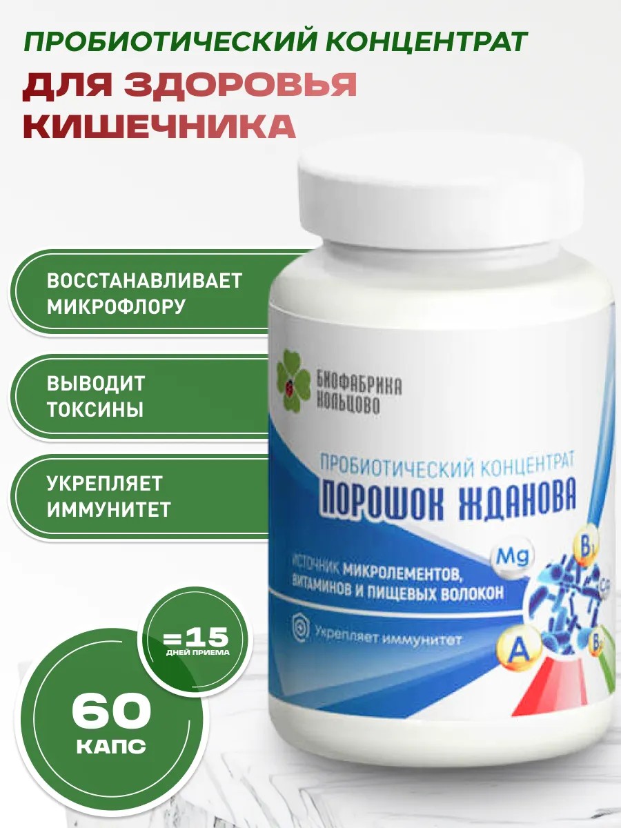 Probiotic concentrate is a biologically active substance in capsule form for oral administration – an improved form of Zhdanov powder. It is used to improve intestinal microflora and overall health. Along with the probiotic microorganism Bacillus subtilis (hay bacillus), it contains chitosan and specially processed pine nut shells. Chitosan exhibits absorbent properties and removes heavy metals from the body. Cedar bran enriches the product with a vitamin-mineral complex and essential amino acids, which, when dissolved in liquid, are easily absorbed by the body. : Probiotic concentrate is a source of dietary fiber and beneficial elements. It contains vitamins A, E, group B, iron, manganese, copper, zinc, calcium, phosphorus, potassium and other micro- and macroelements, tannins, flavonoids, and the amino acids lysine, methionine, and arginine. Beneficial properties of the product: has a beneficial effect on the condition of the intestines, cleanses the walls, improves peristalsis, normalizes microflora; inhibits the growth and development of pathogenic microorganisms (staphylococci, candida, salmonella, streptococci); promotes the elimination of waste and toxins; improves the protective functions and adaptive abilities of the body; maintains the health of the cardiovascular system, prevents the development of atherosclerosis, strengthens the walls of capillaries thanks to flavonoids; exhibits an antioxidant effect, maintaining health and youth at the cellular level; activates metabolic processes, promotes weight loss when following a healthy diet; has an anti-inflammatory effect; has a beneficial effect on the mucous membranes, accelerating the regeneration processes. Instructions: This natural product maintains a healthy intestinal microbiocenosis, populating it with beneficial bacteria, while inhibiting the growth and development of pathogenic microflora. Saturates the body with useful elements, is a source of fiber and antioxidants. As a result of intestinal health, the immune system is strengthened, metabolism is normalized, general condition and well-being improve. There is more energy and strength, mental and physical performance increases. Ingredients: probiotic microorganisms of the Bacillus subtilis species (strain VKPM B-3364), microcrystalline cellulose, cedar bran, chitosan. Nutritional value: proteins - 17.3 g; fats - 4.2 g; carbohydrates - 24.7 g; energy value - 211 kcal (879.6 kJ). Limitations: individual intolerance to product components, allergy to crustaceans. Special instructions: incompatible with antibiotics, is not a medicine, consult a doctor before use. Scope: to normalize the gastrointestinal tract and strengthen the immune system. Directions for use: taken orally during meals. Recommended dose: 2 capsules three times a day. The course of treatment is 10 days. The course can be repeated 2-3 times a year.