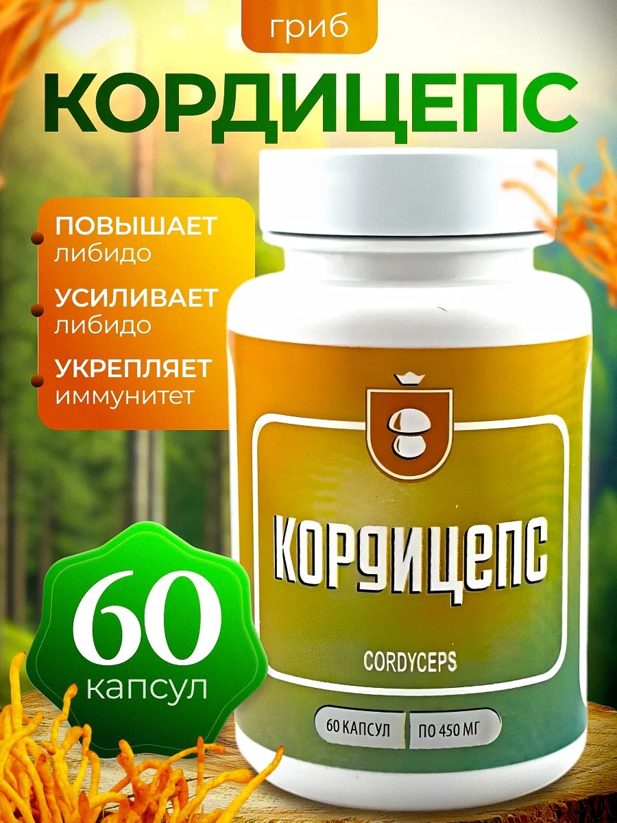 Кордицепс: уникальный гриб, известный своими адаптогенными свойствами. Стимулирует иммунитет, повышает энергию и улучшает общее самочувствие благодаря целебному мицелию.