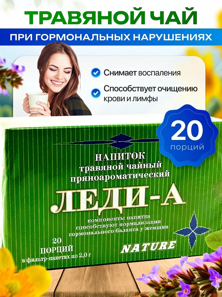 Lady-A herbal drink for cysts, fibroids, and polyps, 20 packets of 2 grams. A women's drink with anti-inflammatory and hormonal balance-regulating properties. It is useful for various hormonal imbalances, inflammatory processes, as well as small cysts, fibroids, polyps, mastopathy, and endometriosis. The plants included in the drink have anti-inflammatory, antiseptic, bactericidal, antispasmodic, and antioxidant properties. They help purify the blood, lymph, and mucous membranes, normalize hormonal balance and urinary function, and help prevent the occurrence and development of hormone-dependent tumors (Russian Federation Patent for Invention No. 2391088). It should be noted that this drink is not a medicine, but a natural product with specific properties, and is intended for those who take good care of their health and prefer to maintain it with the help of natural sources. Directions: Brew the tea with boiling water, using 1 teacup per person. Steep for 10-15 minutes, stirring once or twice during steeping. Drink 3 times daily, regardless of meals. For irrigation, douching, vaginal baths, or tampons, use 1 filter bag per 1 cup of boiling water. Steep for 10-15 minutes, stirring well once or twice during steeping. Ingredients: green tea, lemon balm, St. John's wort, marigold, chamomile flowers, plantain, ginger, mint, knotweed, echinacea, cloves, yarrow, creeping thyme, licorice, kelp, string beggar, garden savory, coriander, and dill. Do not consume the tea if you are allergic to any of the ingredients, or if you are pregnant or breastfeeding. A wonderful New Year's gift for yourself and your loved ones!