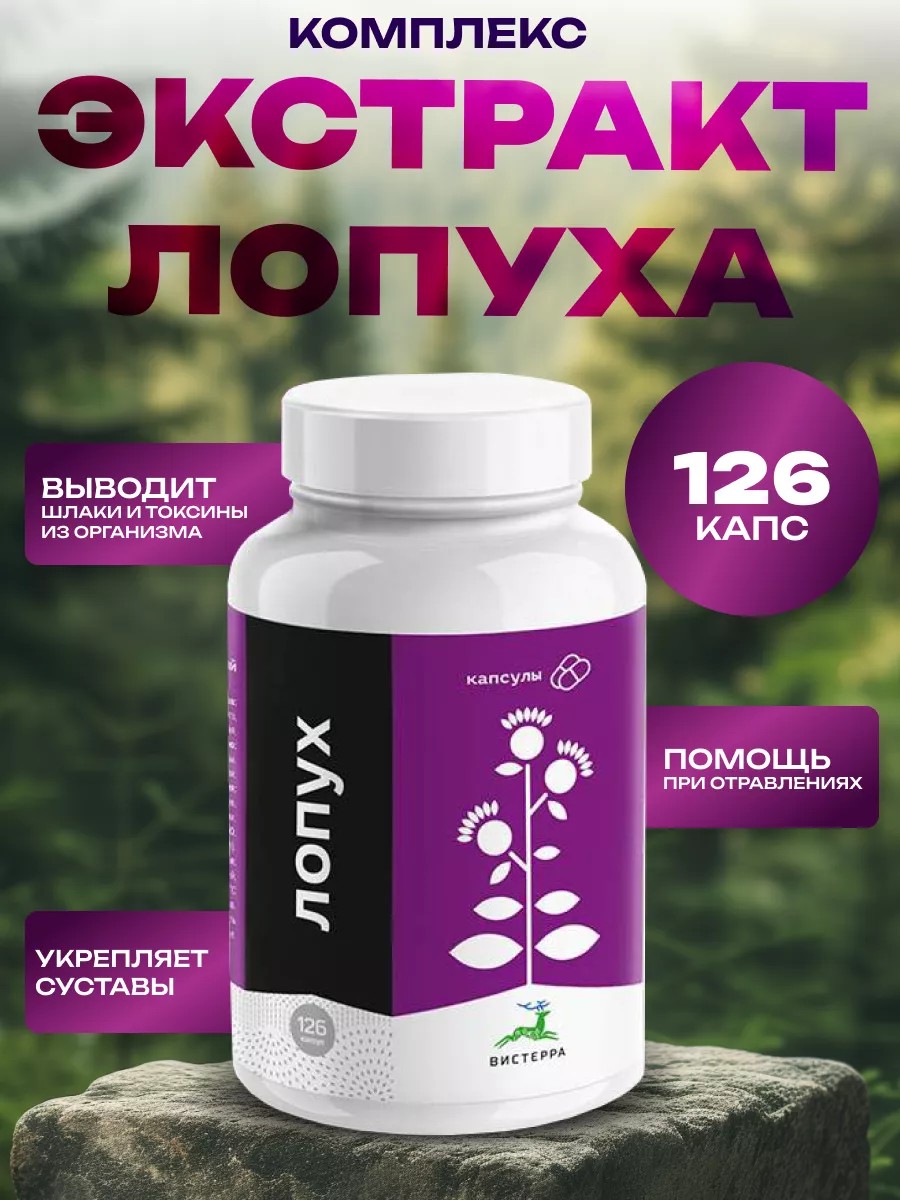 INGREDIENTS: Dry extract of fresh burdock root. Burdock root's chemical composition is truly unique. No other plant can boast such a rich array of components. In publications, burdock root is often referred to as Russian ginseng. The root is an ingredient in many traditional Eastern medicines. Burdock root extract contains amino acids, polysaccharides, inulin, palmitic and stearic acids, tannins, phytosterol, sitosterol, macro- and microelements, and other components. The composition and biological effects of burdock root harvested at different times can vary dramatically. For example, in 2003, Visterra employees first discovered asparagine crystals in spring burdock root extract. However, this substance was not found in the extract obtained from plant roots harvested in the fall. Further studies of the biological action of spring burdock root extract have shown its greater antitumor activity compared to autumn root. APPLICATION: in rehabilitation programs for cancer patients; benign prostatic hyperplasia; diseases of the hepatobiliary system; inflammatory diseases of the gastrointestinal tract; hormone-dependent proliferative diseases - mastopathy, uterine fibroids, endometriosis; carbohydrate, fat and water-salt metabolism disorders; various types of poisoning; gout and salt deposits, joint diseases. RECOMMENDATIONS FOR USE: Capsules are used 3 times a day 20-30 minutes before meals. Adults: For diseases of the hepatobiliary system and gastrointestinal tract (hepatitis, chronic pancreatitis, gastritis, duodenal ulcer) - 2 capsules for 3 weeks. For mastopathy, endometriosis, uterine fibroids and benign prostatic hyperplasia - 4 capsules for 2-6 months. In case of intoxication - 2 capsules for 3-4 weeks. For gout, urolithiasis - 4 capsules for 4-8 weeks 2 times a year. For oncological diseases - 4 capsules for 4 weeks 3 times a year. During chemotherapy and radiation - 4 capsules during breaks between courses of antitumor therapy. Children: Under 6 years - 1 capsule for 3-4 weeks. Children aged 7 to 12 years: 2 capsules for 3-4 weeks. CONTRAINDICATIONS: Individual intolerance to the ingredients. Not a medicine. ENERGY VALUE PER 100 g OF PRODUCT: 299 kcal/1249 kJ. NUTRITIONAL VALUE PER 100 g OF PRODUCT: Carbohydrates - 70 g, proteins - 25 g. GMO-FREE. A wonderful New Year's gift for yourself and your loved ones!