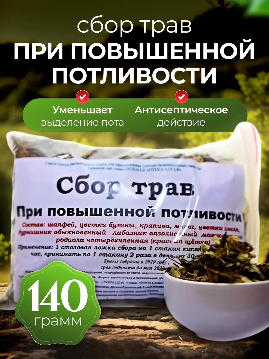 Danila Travnik's Herbal Collection for Excessive Sweating, 140g. This herbal collection normalizes sweat secretion, relieves irritation, and has an antifungal and deodorizing effect on the skin. Ingredients: elderflower, mint, hop flowers, meadowsweet, and Rhodiola quadrifida (red brush). Directions: Add 1 tablespoon of the mixture to 1 cup of boiling water, let steep for 1 hour, and take 1 cup 2 times a day, 30 minutes before meals. Contraindications: individual intolerance, pregnancy, and breastfeeding. A wonderful New Year's gift for yourself and your loved ones!