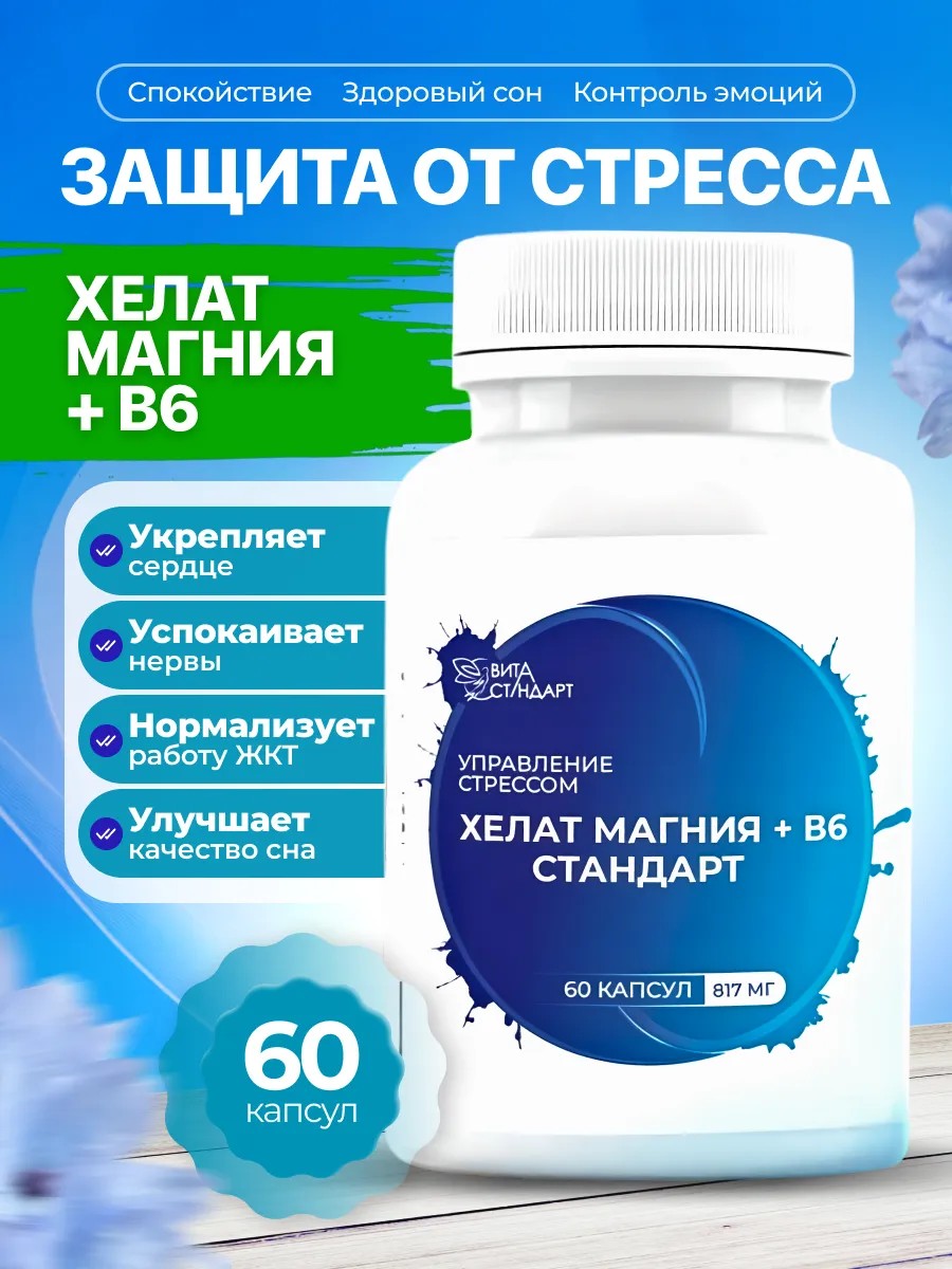 БАД «Хелат магния + В6 - Стандарт». Характеристики и отличительные особенности: -изготовлен из сырья высокого качества в виде капсул массой 817 мг.; -не содержит добавок, ароматизаторов, красителей; -носитель – микрокристаллическая целлюлоза; В 4-х капсулах продукта содержится 544 мг элементарного магния (136% от рекомендуемого уровня суточного потребления) и 6 мг витамина В6 (пиридоксина гидрохлорида). хелатная форма (бисглицинат магния) – это соединение Магния с остатком органической аминокислоты (глицином). Простыми словами — это ионы минерала, погруженные в белок и готовые к использованию и транспортировке клетками эпителия тонкой кишки, где происходит основной процесс усвоения. хорошо усваивается (до 90%) без побочных эффектов со стороны ЖКТ (не вызывает вздутия, запоров и диареи), так как имеет нейтральную кислотность и не раздражает слизистые оболочки; витамин В6 (пиридоксина гидрохлорид)участвует в более чем 100 биохимических реакциях человеческого организма: в клеточном метаболизме, синтезе гемоглобина, инсулина, некоторых половых гормонов; помогает снять стресс и усталость, облегчает состояние при заболеваниях суставов и сердца, положительно влияет на состояние центральной нервной системы; БАД «Хелат магния + В6 – Стандарт» разработан для поддержания спокойствия и здорового сна, способствуя укреплению нервной системы. В его состав входят магний и витамин B6, которые играют важную роль в регуляции нервных процессов и обеспечении полноценного отдыха. Регулярный прием этого комплекса может помочь уменьшить чувство тревоги, улучшить качество сна и повысить стрессоустойчивость; соответствует по показателям безопасности Техническому регламенту Таможенного союза "О безопасности пищевой продукции "ТР ТС021|2001", продукт сертифицирован. 1) Биологически активные вещества: Магний Содержание в 4 капсулах (суточной порции): 544 мг % от РУСП1: 136^2 2) Биологически активные вещества: Витамин В6 Содержание в 4 капсулах (суточной порции): 6 мг % от РУСП1: 300^2 Продолжительность приема: 1 месяц. При необходимости прием можно повторить. Противопоказания: индивидуальная непереносимость компонентов, беременность, кормление грудью. Перед применением рекомендуется проконсультироваться с врачом. Рекомендации по применению: принимать 1-2 раза в день во время еды, лучше перед сном. Дозировка подбирается индивидуально: от 2-х до 4-х капсул в сутки. Состав капсул: магния бисглицинат, оболочка капсулы (загуститель – гидроксипропилметилцеллюлоза), носитель – микрокристаллическая целлюлоза, пиридоксина гидрохлорид (витамин В6). Условия хранения: хранить в сухом, защищённом от прямых солнечных лучей, недоступном для детей месте при температуре не выше 25°С. Срок годности: 2 года.